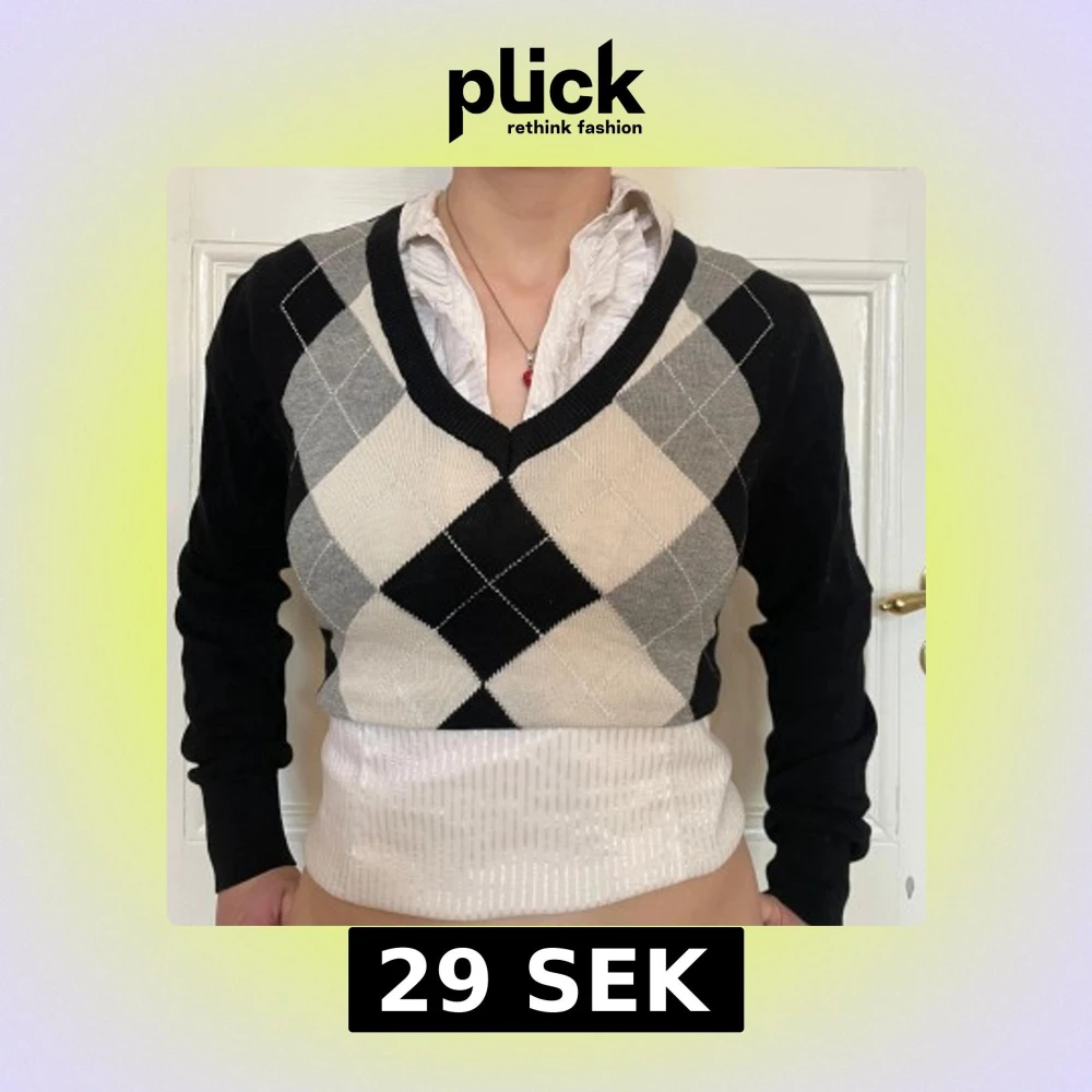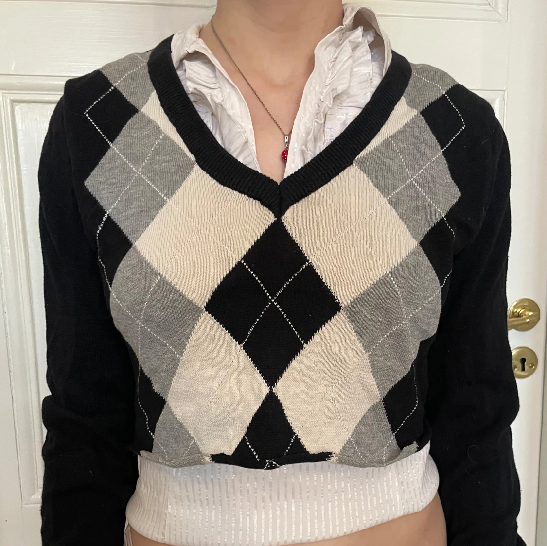 Snygg croppad kofta med klassiskt argylemönster i svart, grått och vitt. Tröjan har v-ringad hals och långa ärmar. Perfekt för dig som gillar preppy stil och vill sticka ut med en tidlös look. Stickad i mjukt material som känns skönt mot huden.