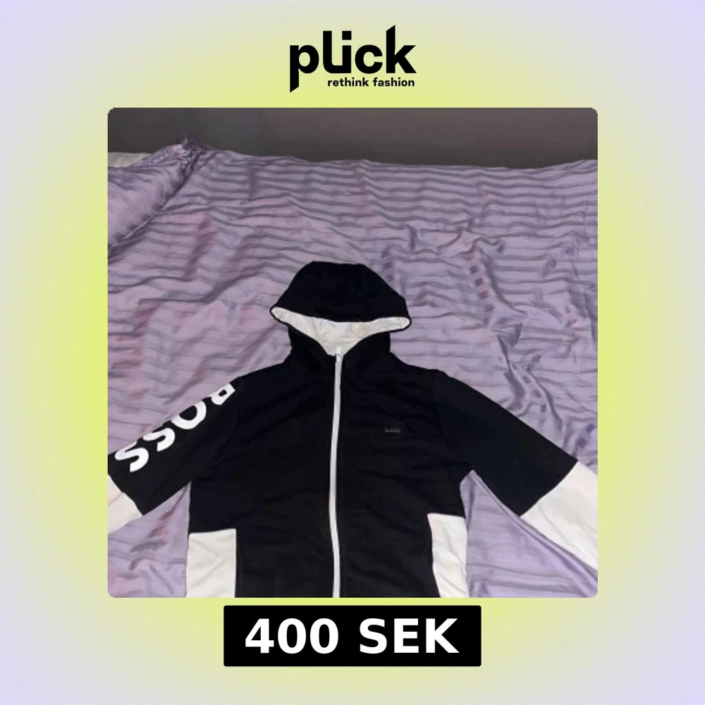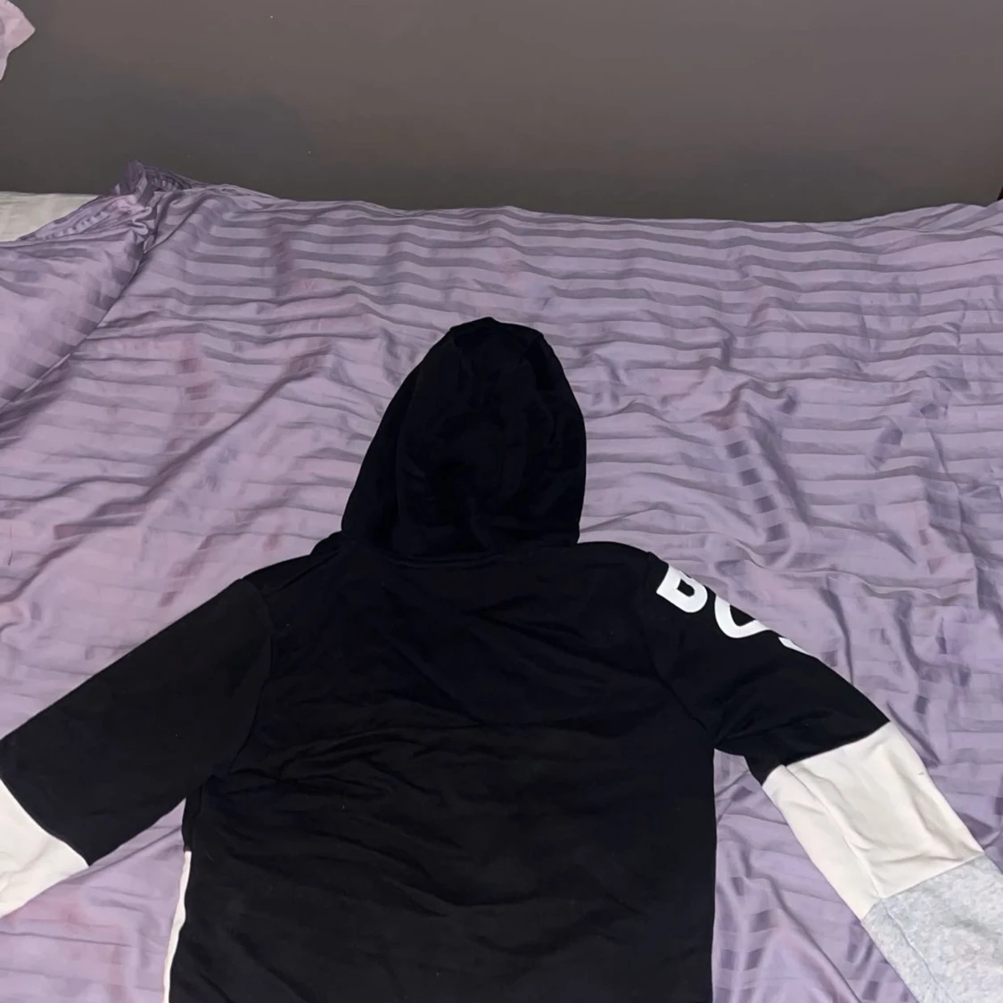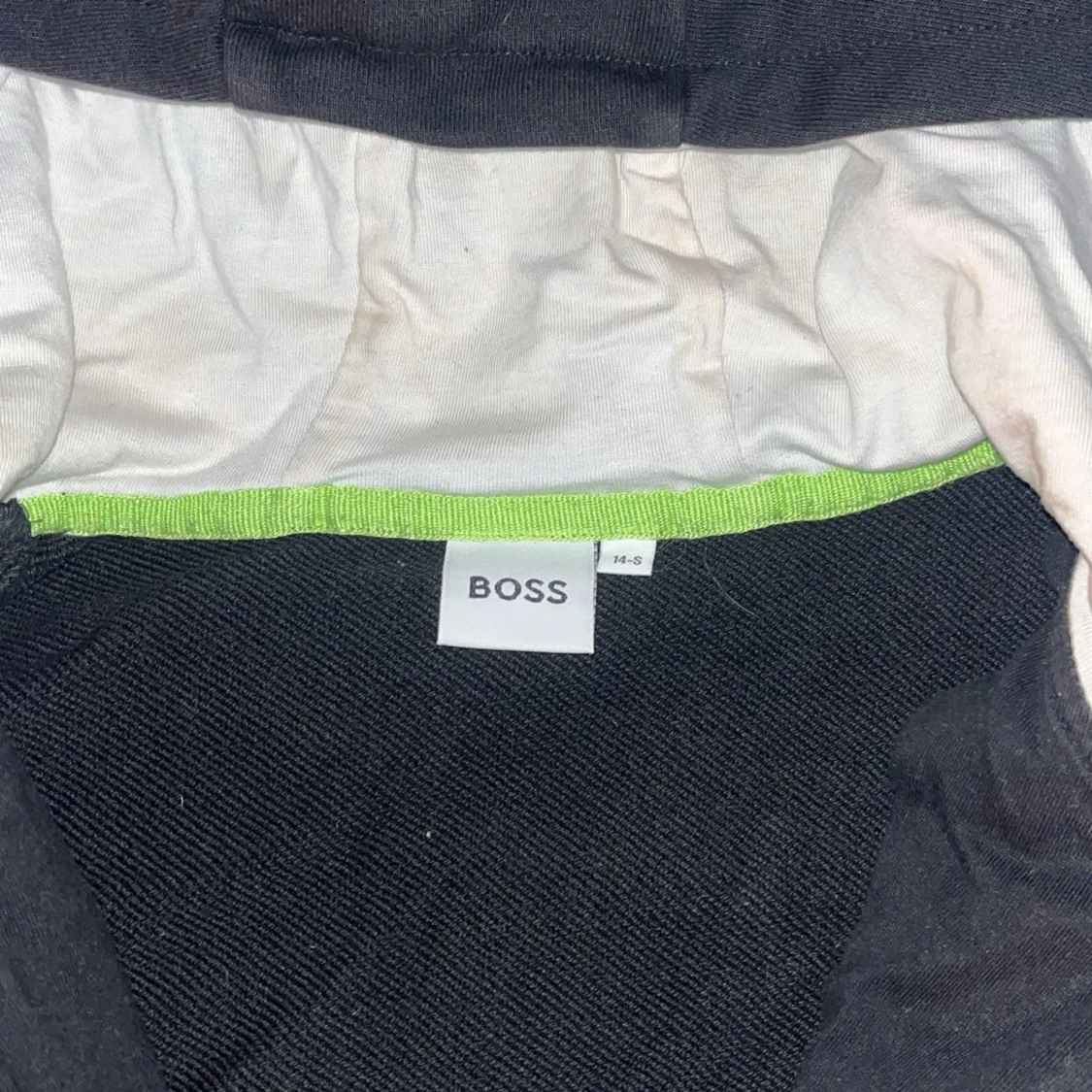 Snygg svart och vit hoodie från BOSS med dragkedja framtill och stor huva. Ärmarna har kontrasterande vita partier och BOSS-loggan tryckt i vitt på ena ärmen. Perfekt för dig som gillar streetwear och vill sticka ut lite extra.