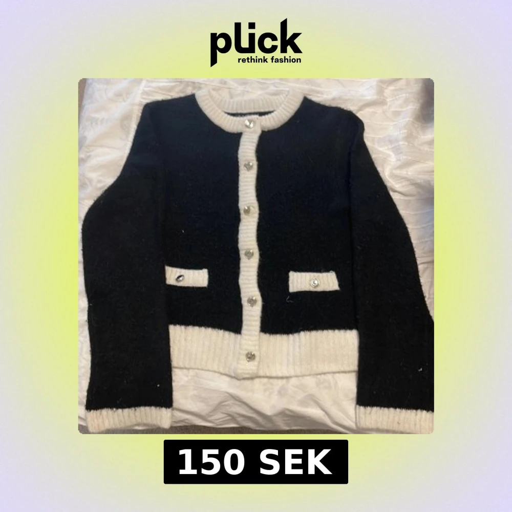 Kofta från Amisu i svart med kontrasterande vita ribbade kanter och detaljer. Rund hals, långa ärmar och silvriga knappar framtill. Två dekorativa fickor med vita kanter och knapp. Mjuk stickad känsla, perfekt för lager-på-lager.