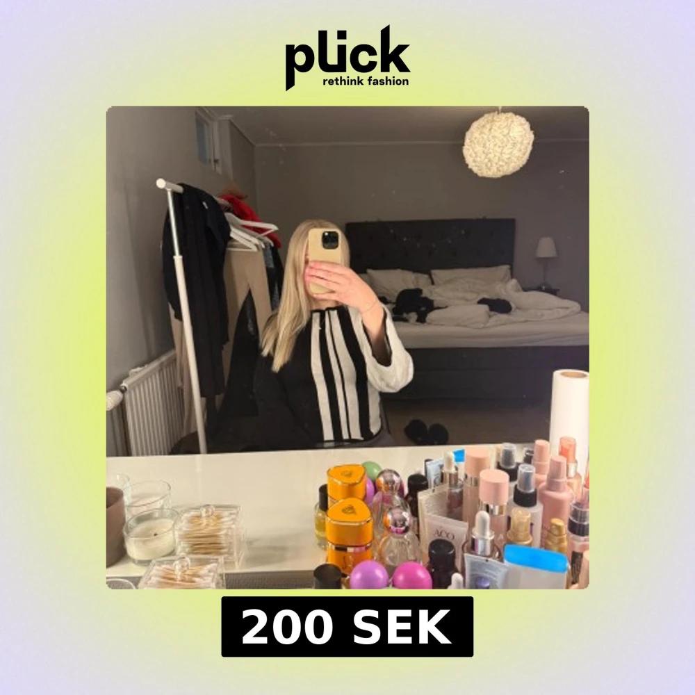 Säljer en stilren svart och vit tröja med långa ärmar. Tröjan har ett unikt randigt mönster framtill som ger en modern touch. Perfekt för dig som vill ha något annorlunda i garderoben!