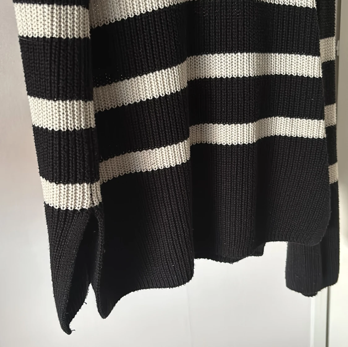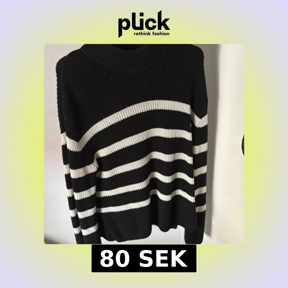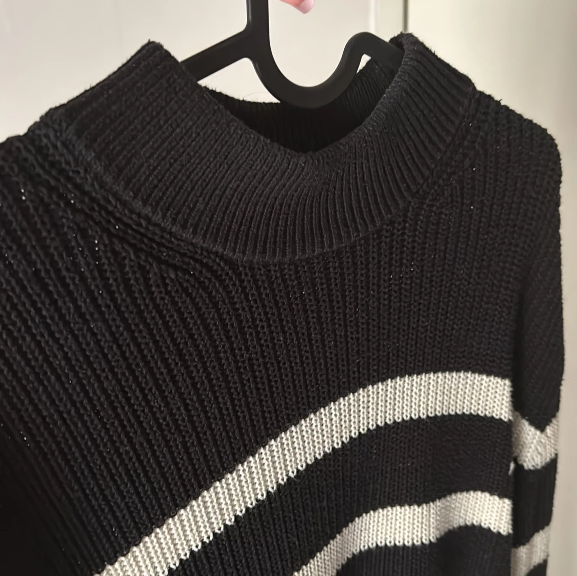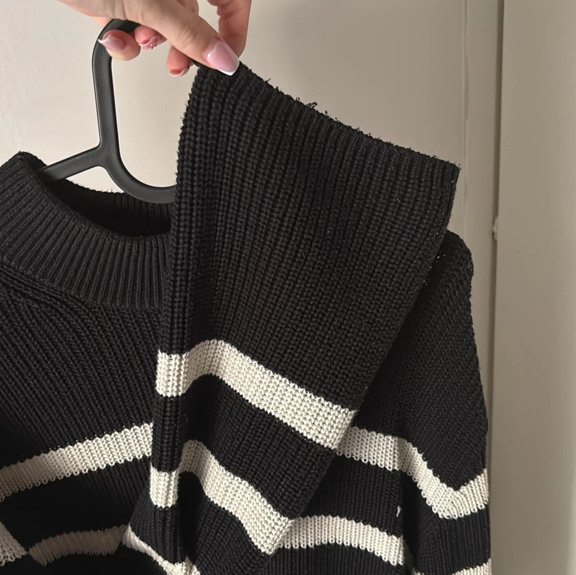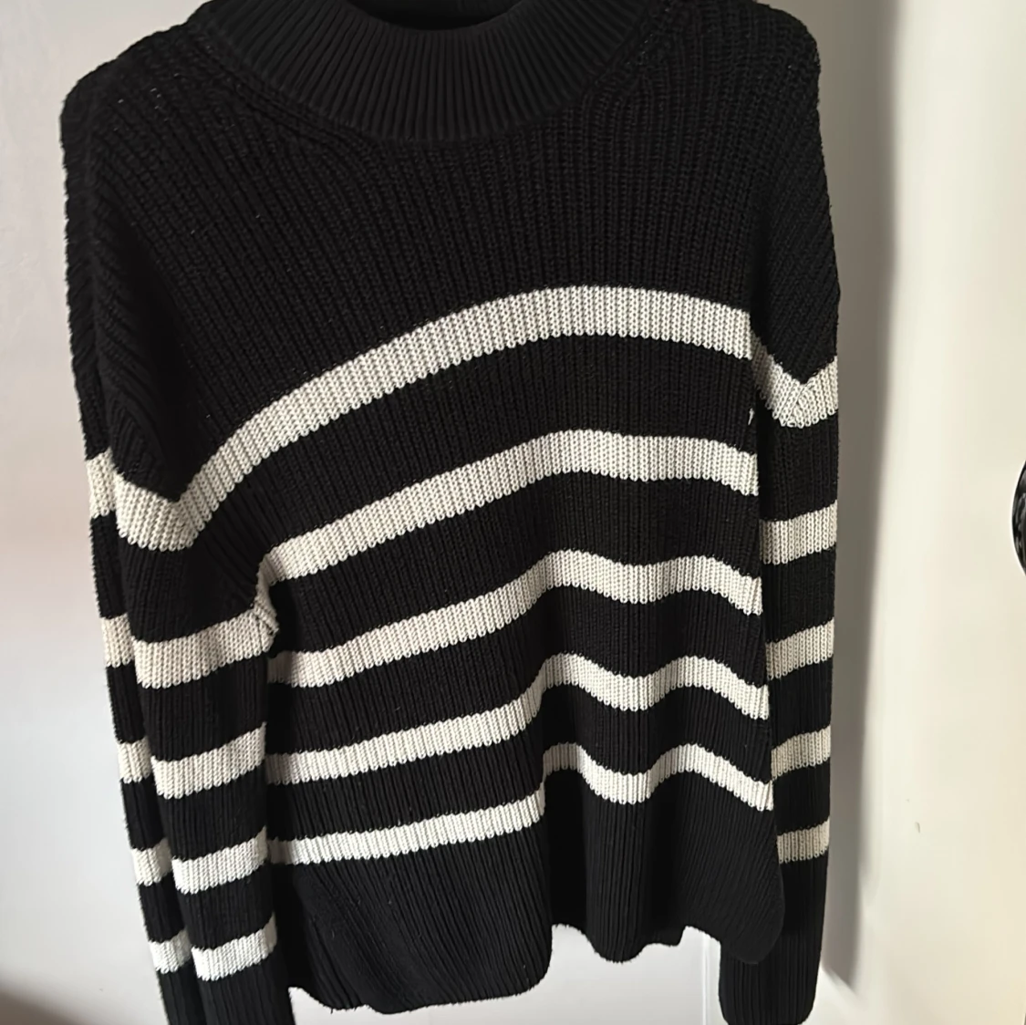 Säljer en svart stickad tröja med vita horisontella ränder och medelhög krage. Tröjan har lång ärm och är gjord i ett grovstickat material som känns både trendigt och bekvämt. Perfekt för lager-på-lager-stil. Är i stl XS sitter som en S