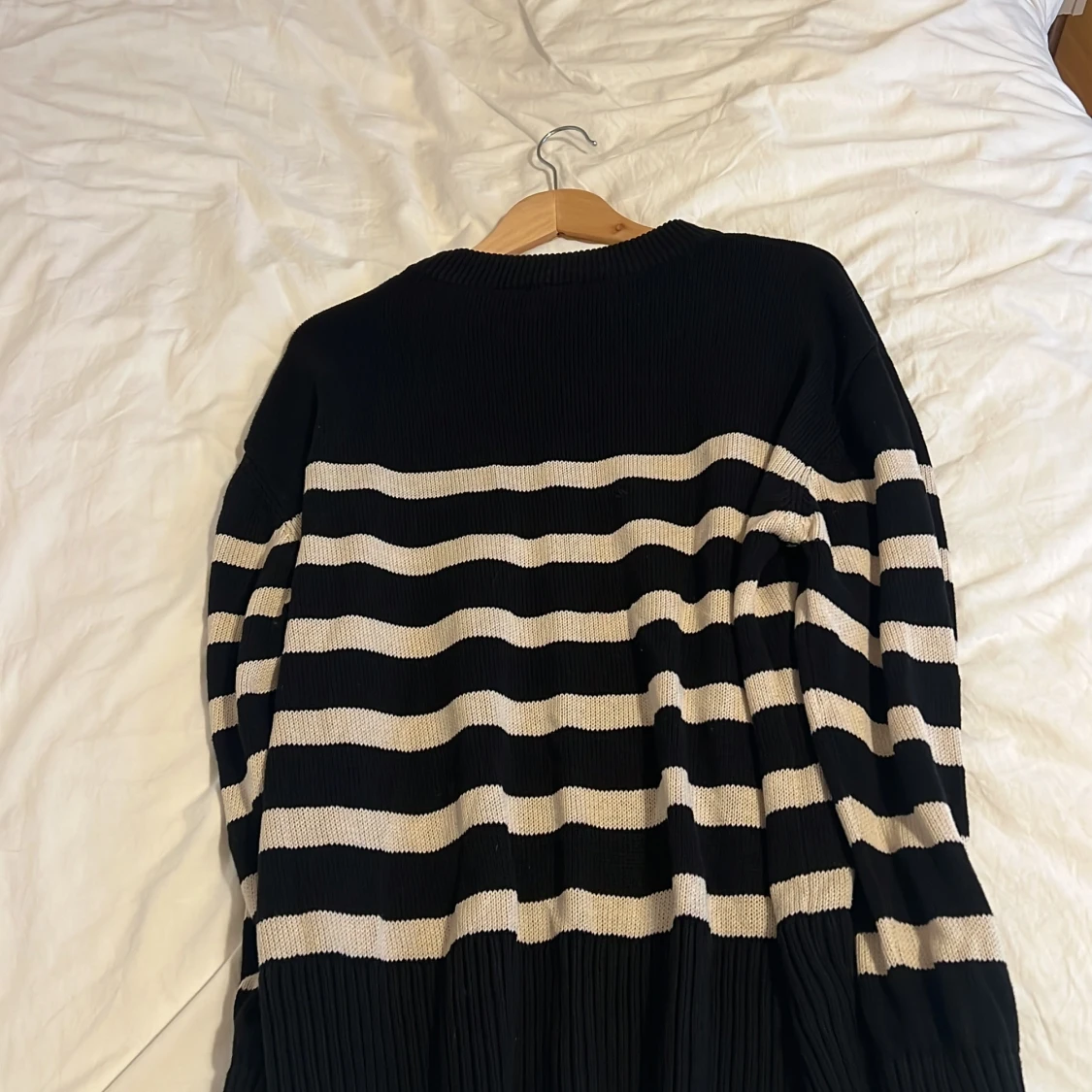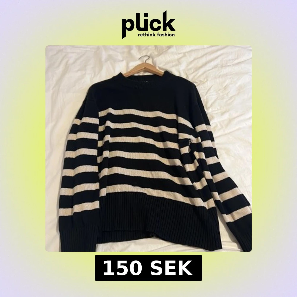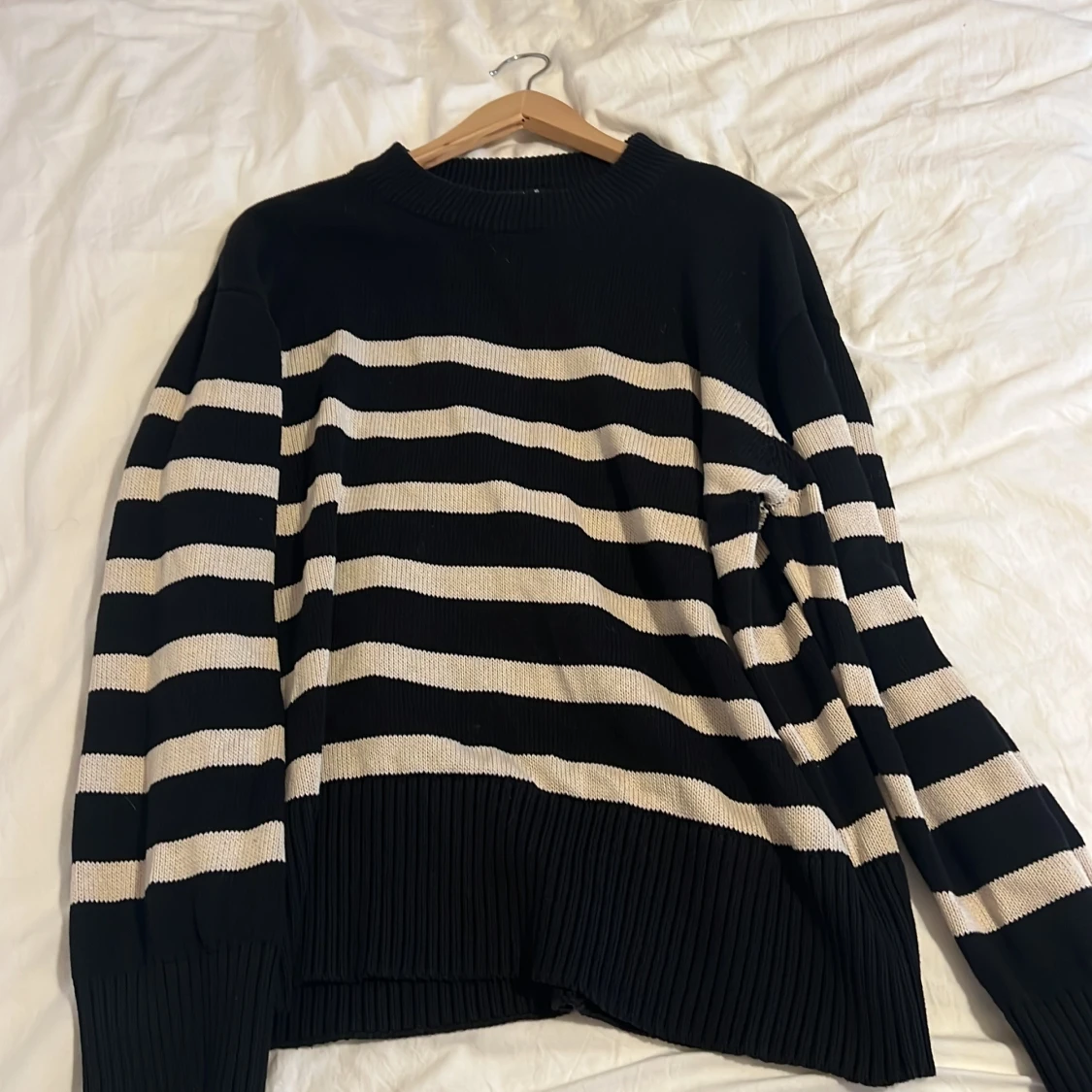 Säljer en snygg svart och vit randig tröja från Gina Tricot. Tröjan är stickad med långa ärmar och har en bekväm passform. Perfekt för kyligare dagar.