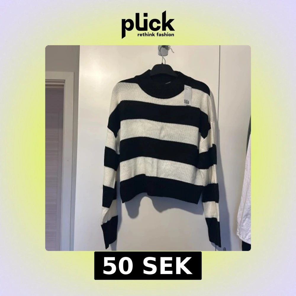 Säljer en snygg svart och vit randig tröja från h&m. Tröjan har långa ärmar och en rund halsringning. Helt oanvänd och lappen sitter kvar.