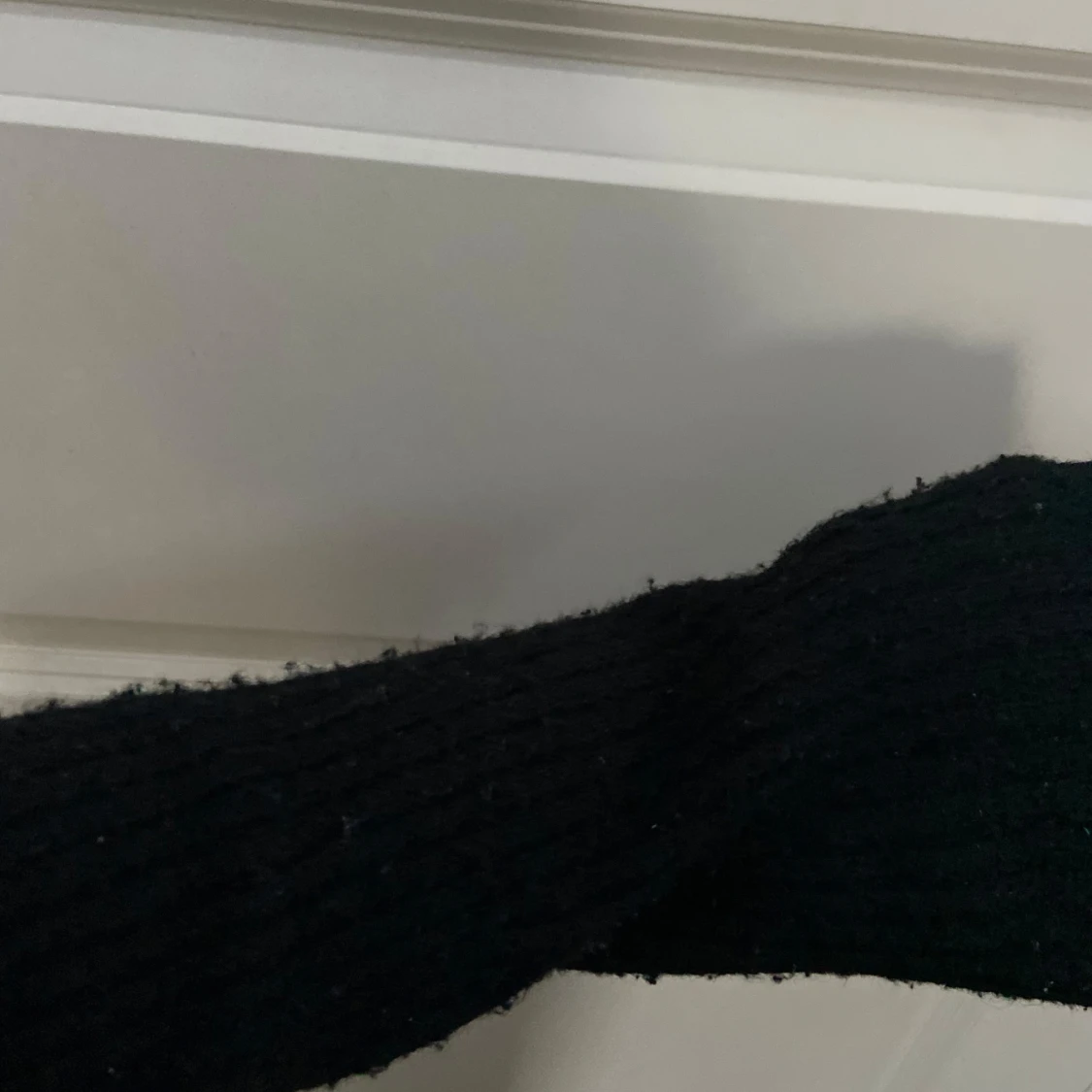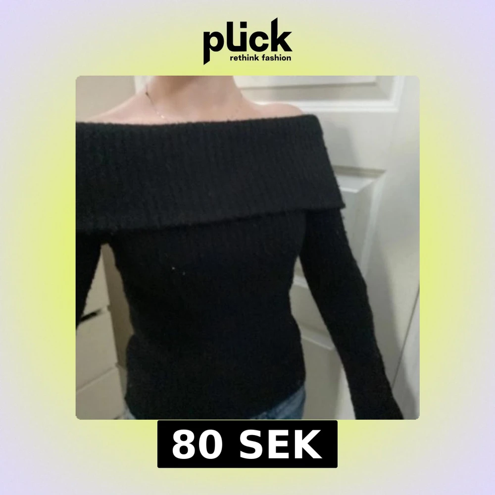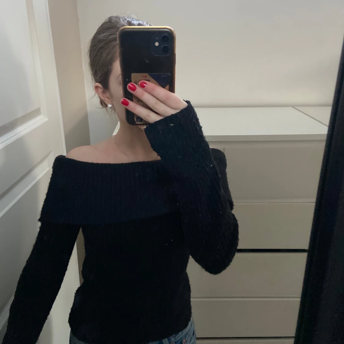 Snygg svart offshoulder tröja i stickat material. Perfekt för en stilren look med långa ärmar och en bred krage som ger en elegant touch. Passar bra till både jeans och kjol. Fint skick men tyvärr lite nopprig som man ser på bilderna.💕💕