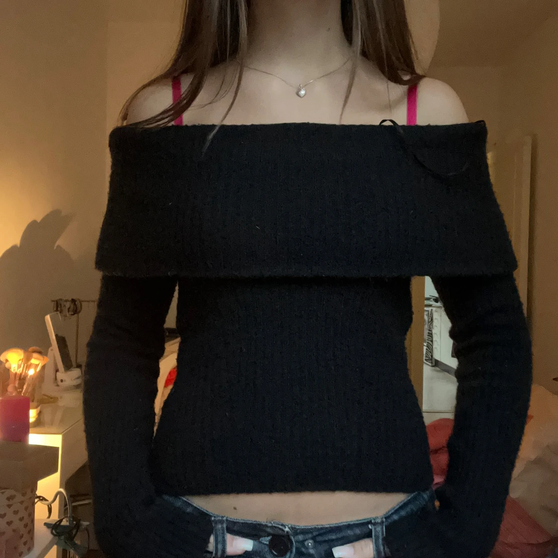 Säljer en svart stickad tröja med offshoulder-design och långa ärmar. Tröjan är croppad och har en bred kant upptill som ger en snygg och trendig look. Perfekt för dig som gillar en stilren men ändå edgy vibe.