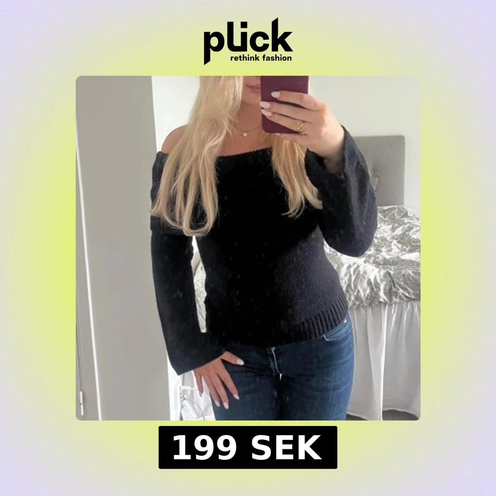 Säljer en svart stickad tröja som är offsholder med utsvängda armar den är varm och gosig och perfekt till hösten🍂