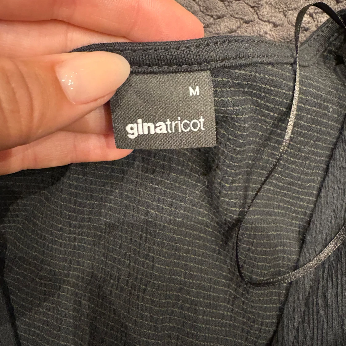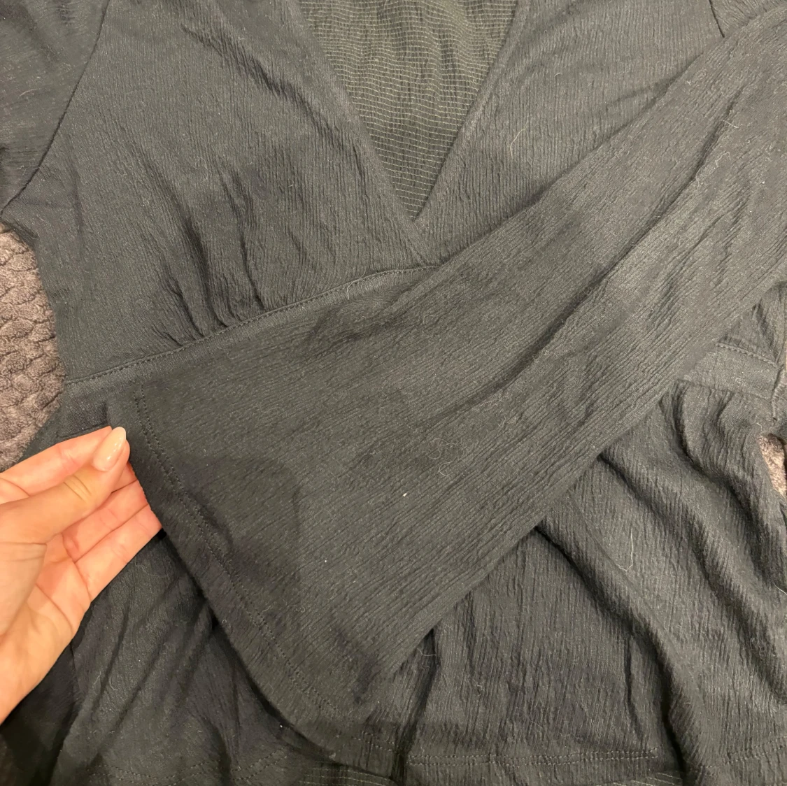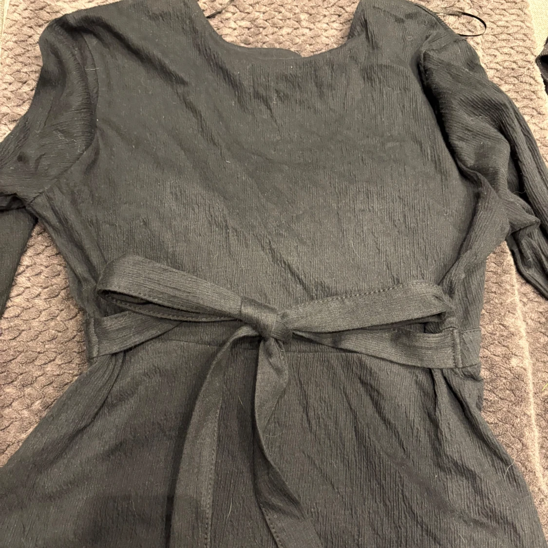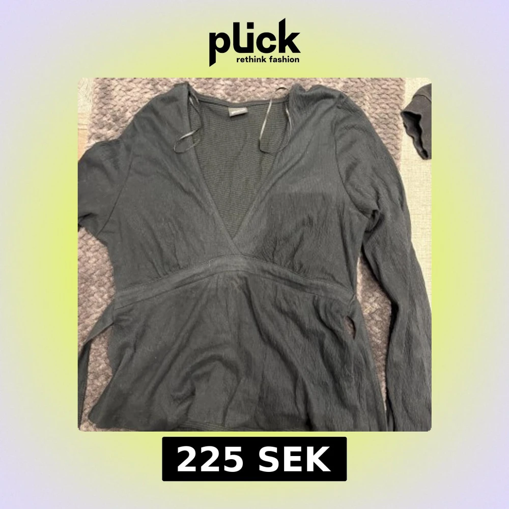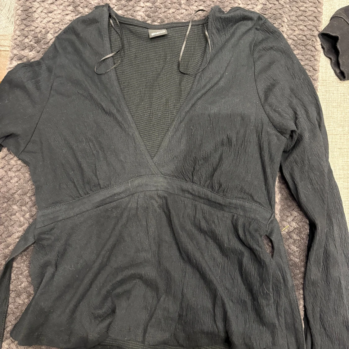 Svart omlottblus från Gina Tricot med v-ringning och långa ärmar. Blusen har knytband i midjan och är tillverkad i ett lätt, strukturerat tyg som ger en snygg och avslappnad look. Perfekt att styla med jeans eller kjol.