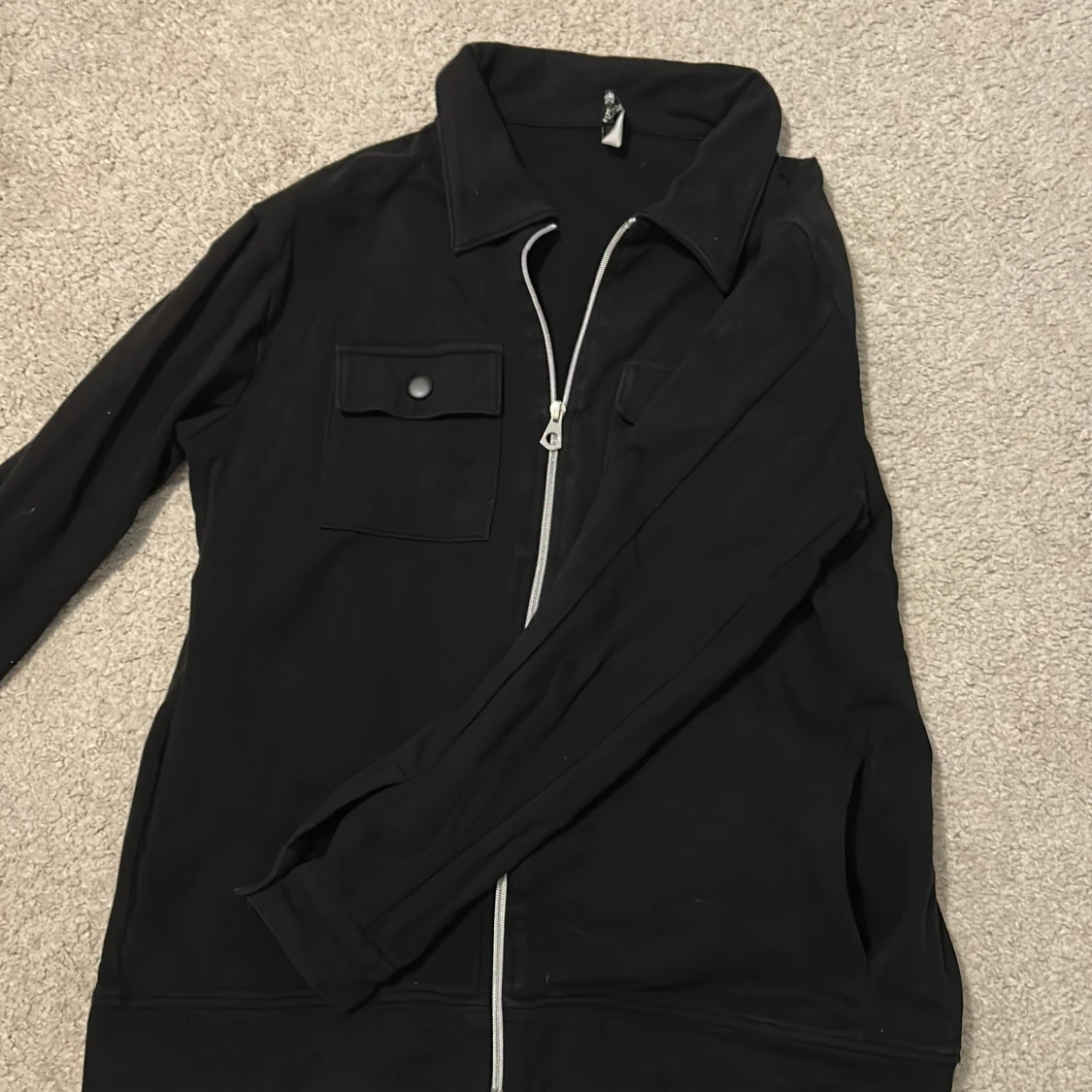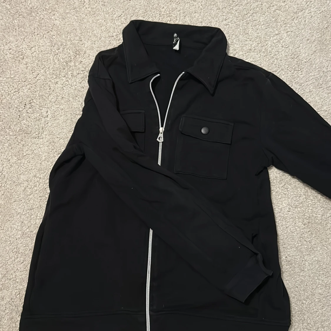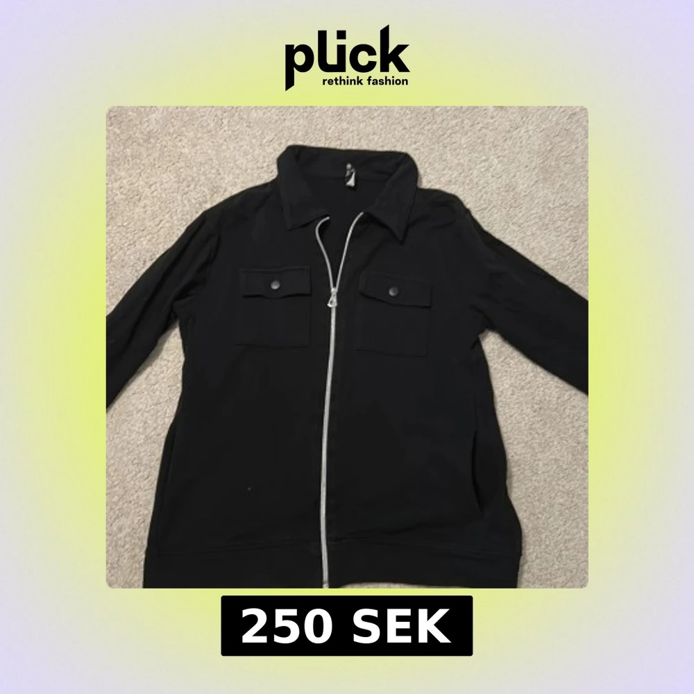 Svart overshirt med silverfärgad dragkedja framtill och två bröstfickor med lock och knapp. Jackan har klassisk krage och långa ärmar. Perfekt för lager-på-lager och enkel att styla till olika outfits. Storlek 176