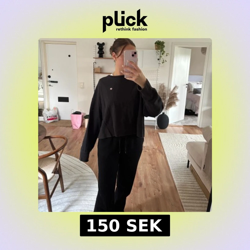 Säljer en svart oversized sweatshirt från Champion med liten broderad logga på bröstet och ärmslutet. Tröjan har långa ärmar och en klassisk rund halsringning. Perfekt för en avslappnad och sportig stil.