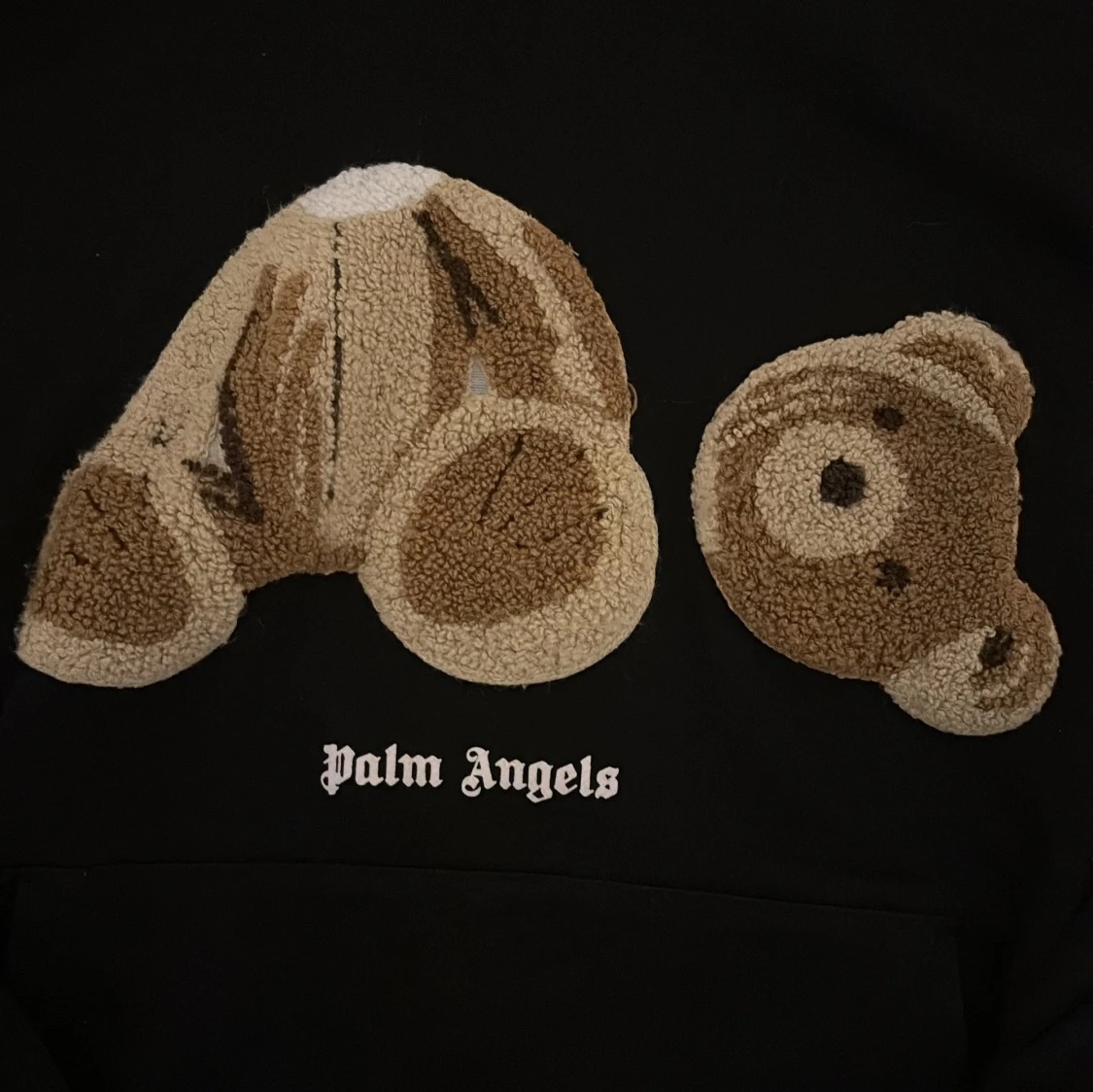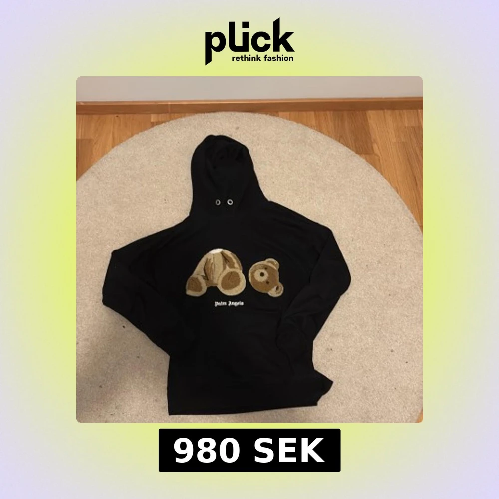 Svart hoodie från Palm Angels med ikoniskt björn-motiv i beige och brunt framtill. Tröjan har huva med snörning och klassisk logga under motivet. Perfekt statement-plagg för dig som gillar streetwear och unika detaljer.
