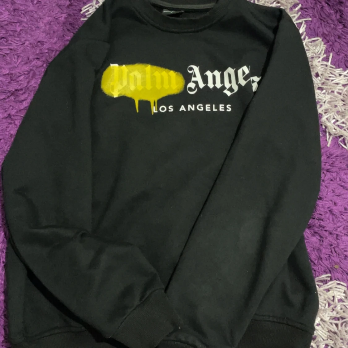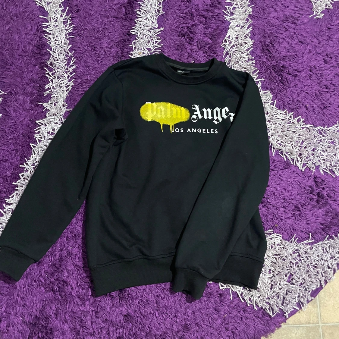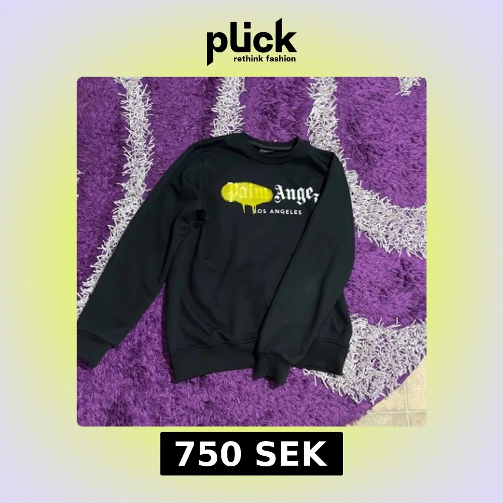 Svart sweatshirt från Palm Angels i storlek S med ikonisk logga och gul drip-effekt på bröstet. Tröjan har rund hals, ribbade muddar och är långärmad. Materialet är mjukt och känns som bomull eller polyester. Perfekt för dig som gillar streetwear och vill sticka ut.