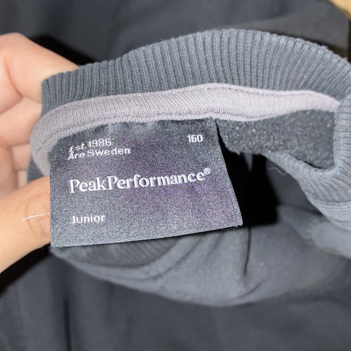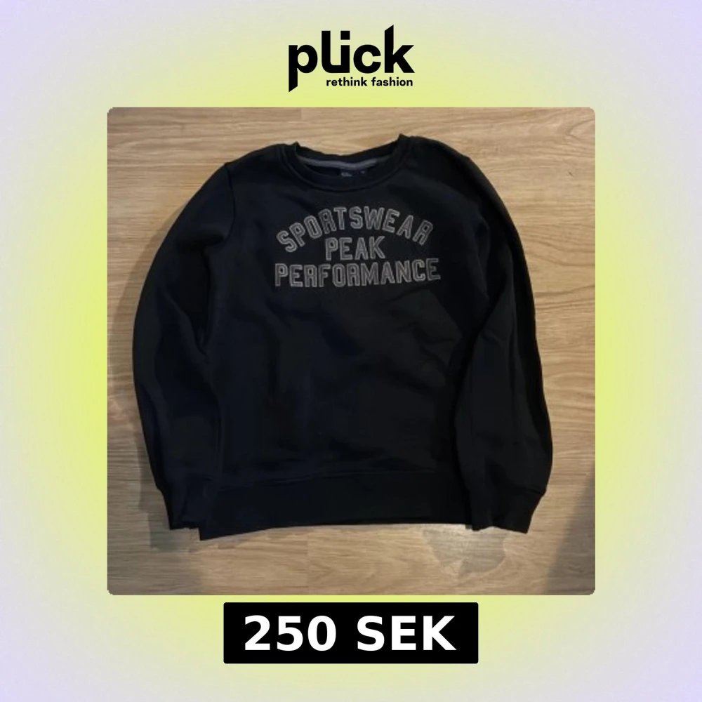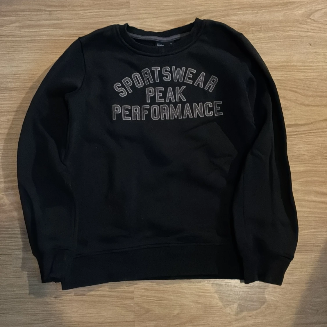 Svart sweatshirt från Peak Performance med tryckt text 'SPORTSWEAR PEAK PERFORMANCE' på bröstet. Tröjan har rund hals, långa ärmar och ribbade muddar. Perfekt för dig som gillar sportig och enkel stil. Juniorstorlek 160. Den passar inte längre mig. Är flexibel med pris hör av er vid frågor eller prisförslag