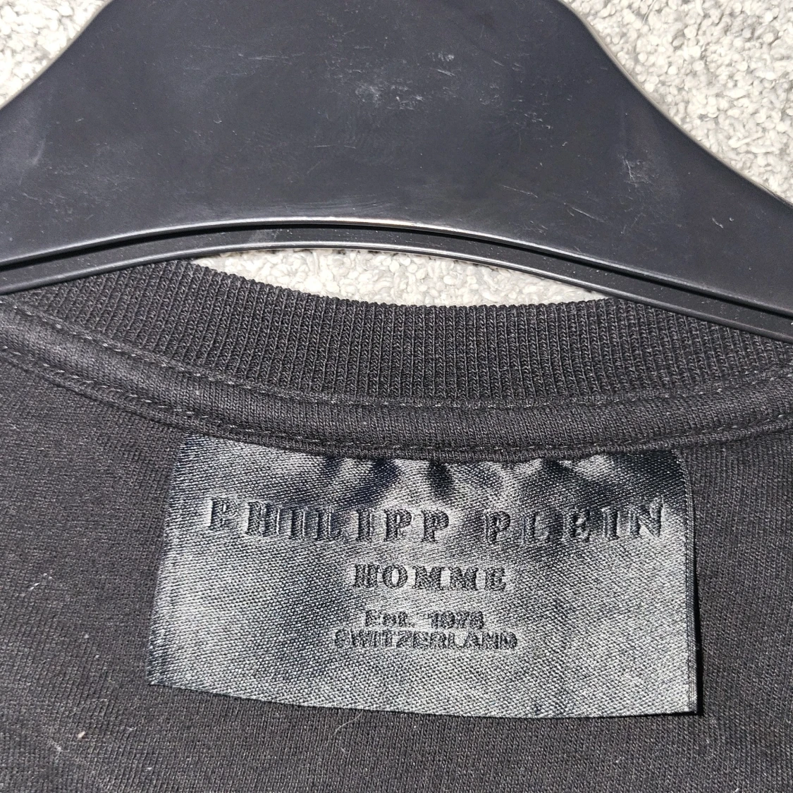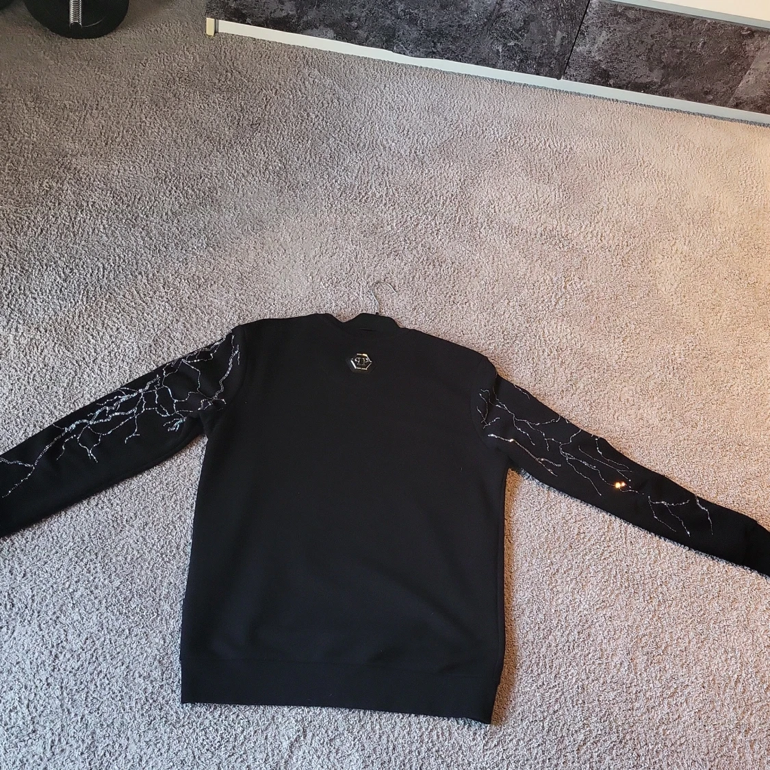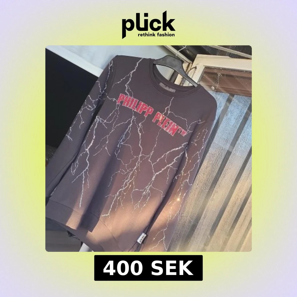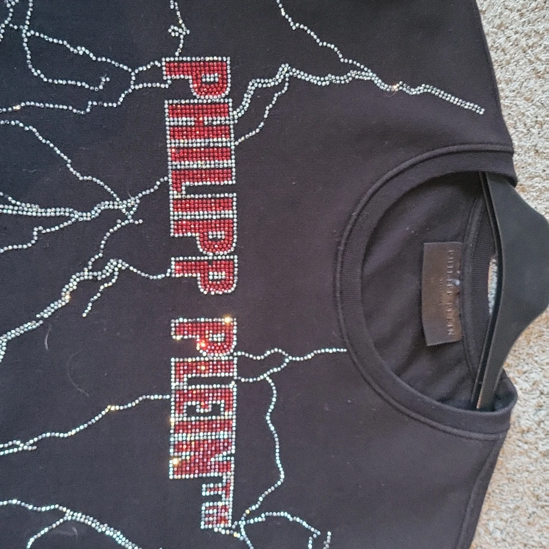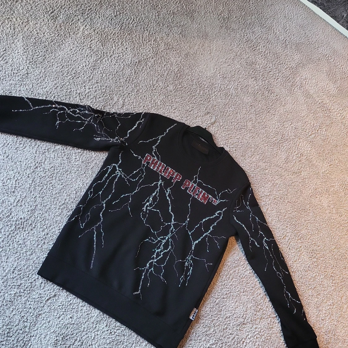 Svart långärmad tröja från Philipp Plein med glittrande blixtmönster i silver och röd logga framtill i stenar. Tröjan har rund halsringning och en snygg detalj på ryggen. Perfekt för dig som vill sticka ut med en cool och exklusiv look. Storleken tar vi i privat.