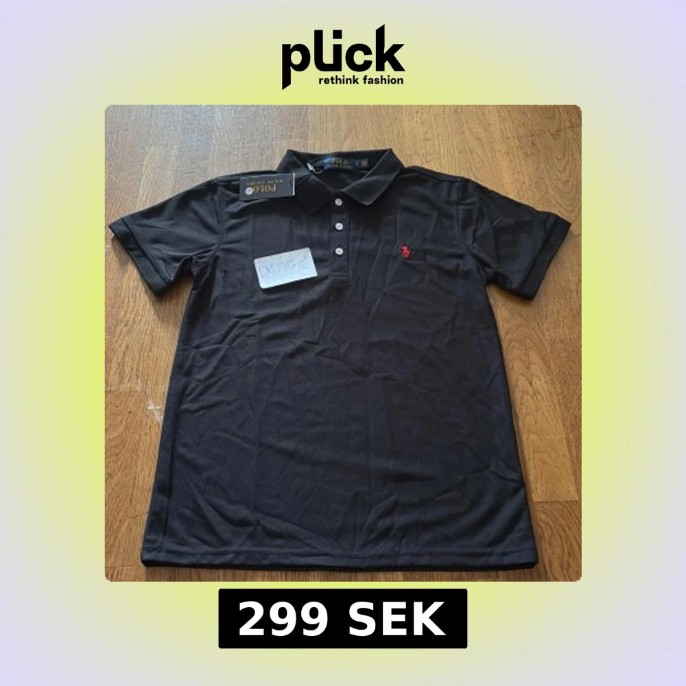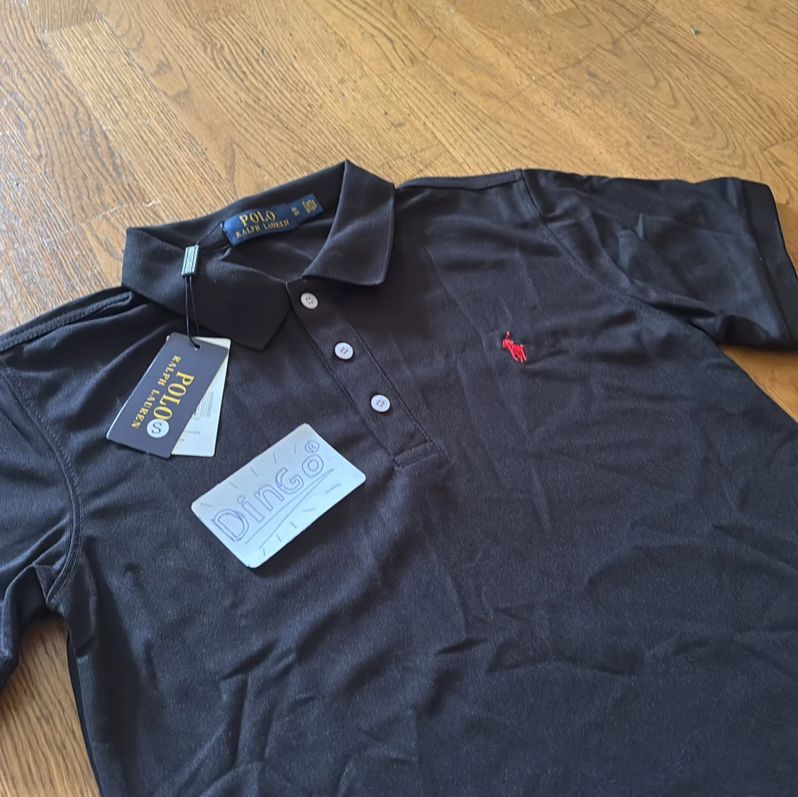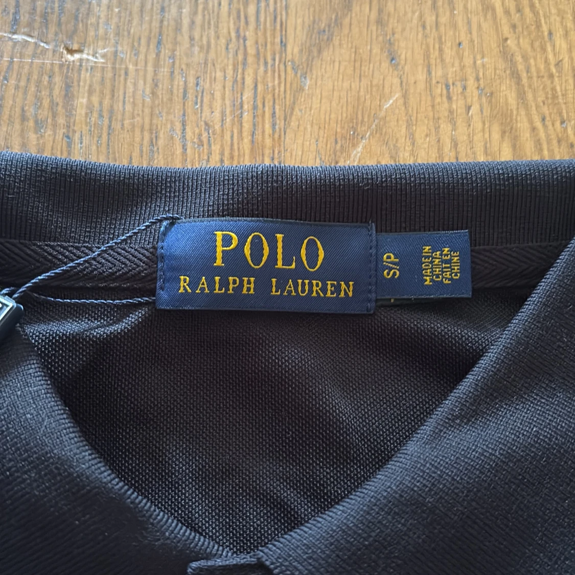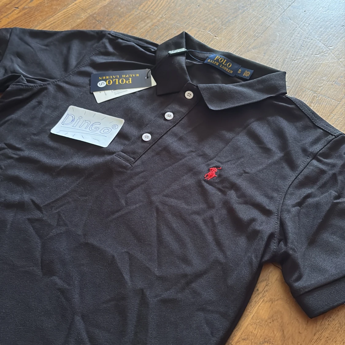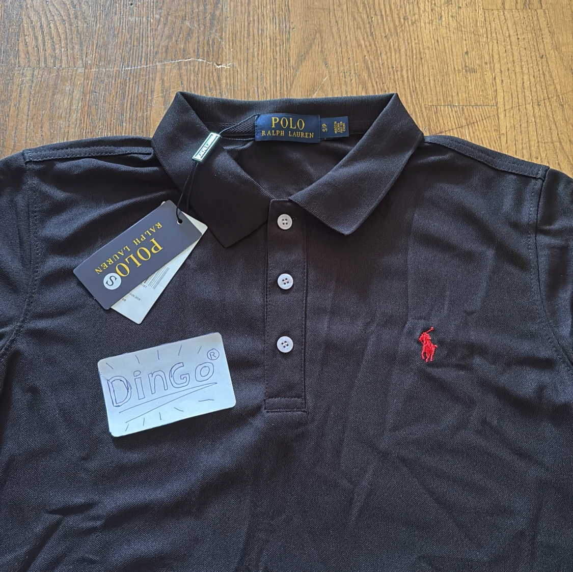 Klassisk svart pikétröja från Ralph Lauren med tre vita knappar och röd broderad logga på bröstet. Tröjan har korta ärmar och är tillverkad i mjuk bomull som känns skön mot huden. Perfekt för en clean och stilren look.