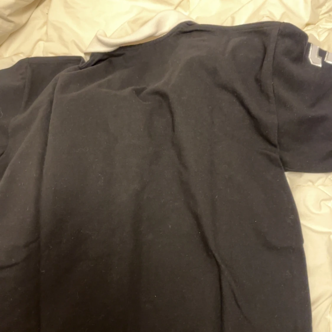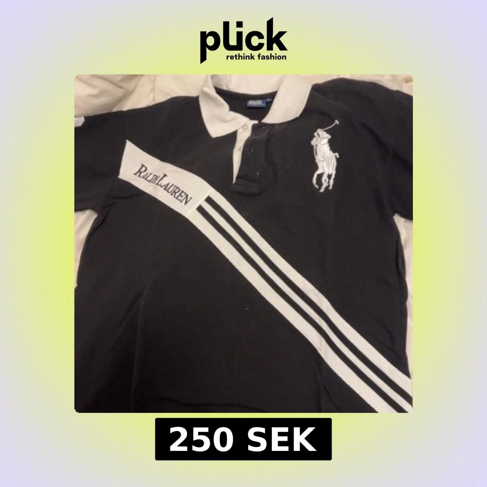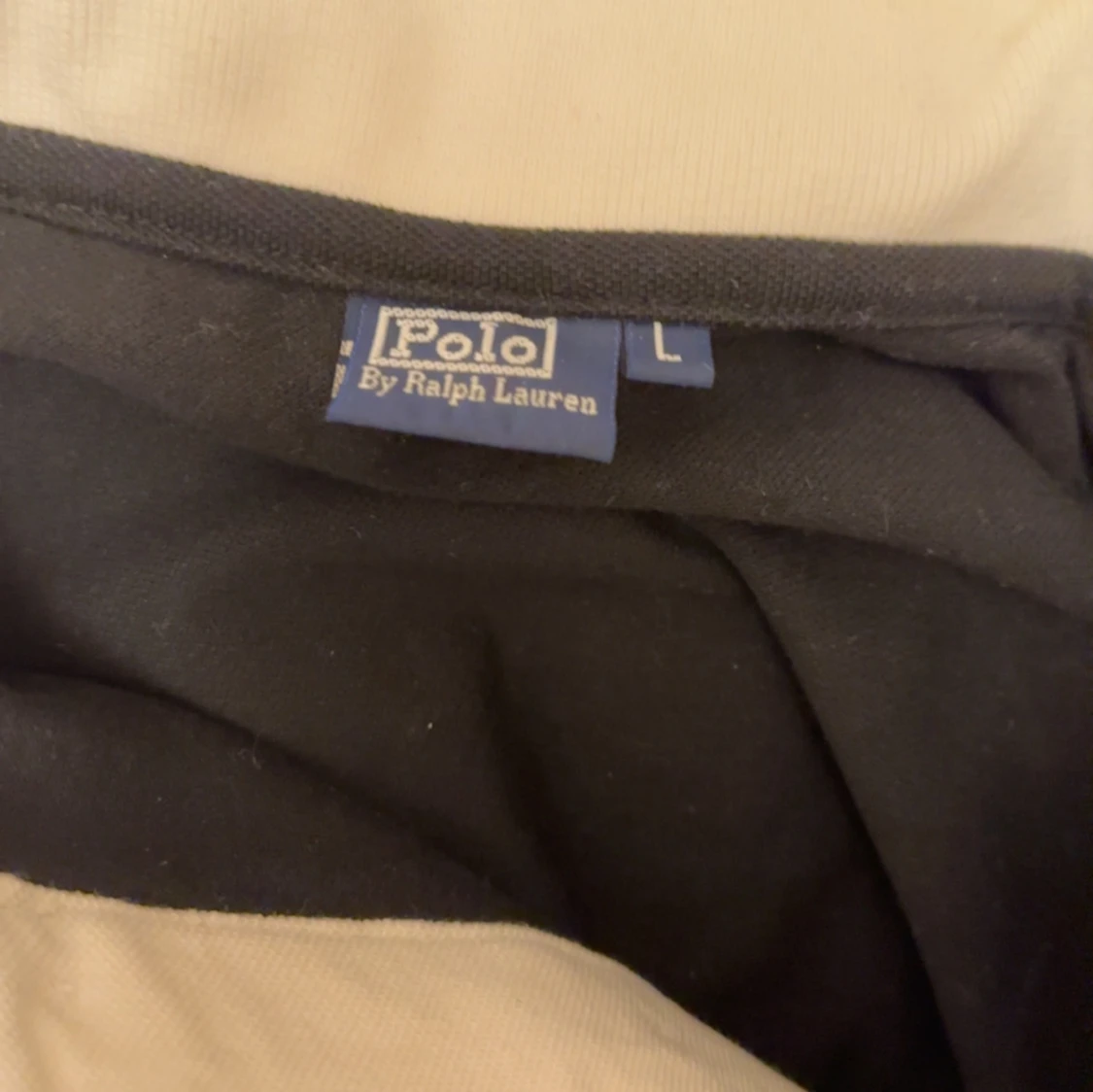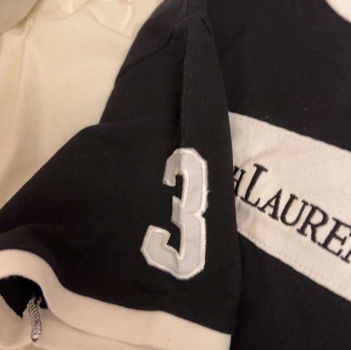 Säljer en klassisk svart pikétröja från Ralph Lauren med vit krage och detaljer. Tröjan har en stor logga på bröstet och ett nummer på ärmen. Perfekt för en stilren look!