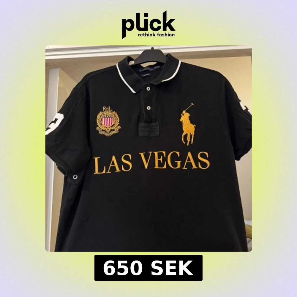 Snygg svart pikétröja från Ralph Lauren med 'Las Vegas' tryck i guld på framsidan. Perfekt för en stilren look. Sitter som en L Pris kan diskuteras.