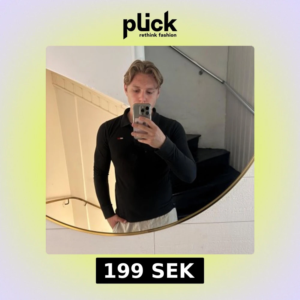 Säljer en klassisk svart pikétröja från Tommy Hilfiger med liten broderad logga på bröstet. Tröjan har långa ärmar och krage med knappar. Perfekt för en stilren och avslappnad look.