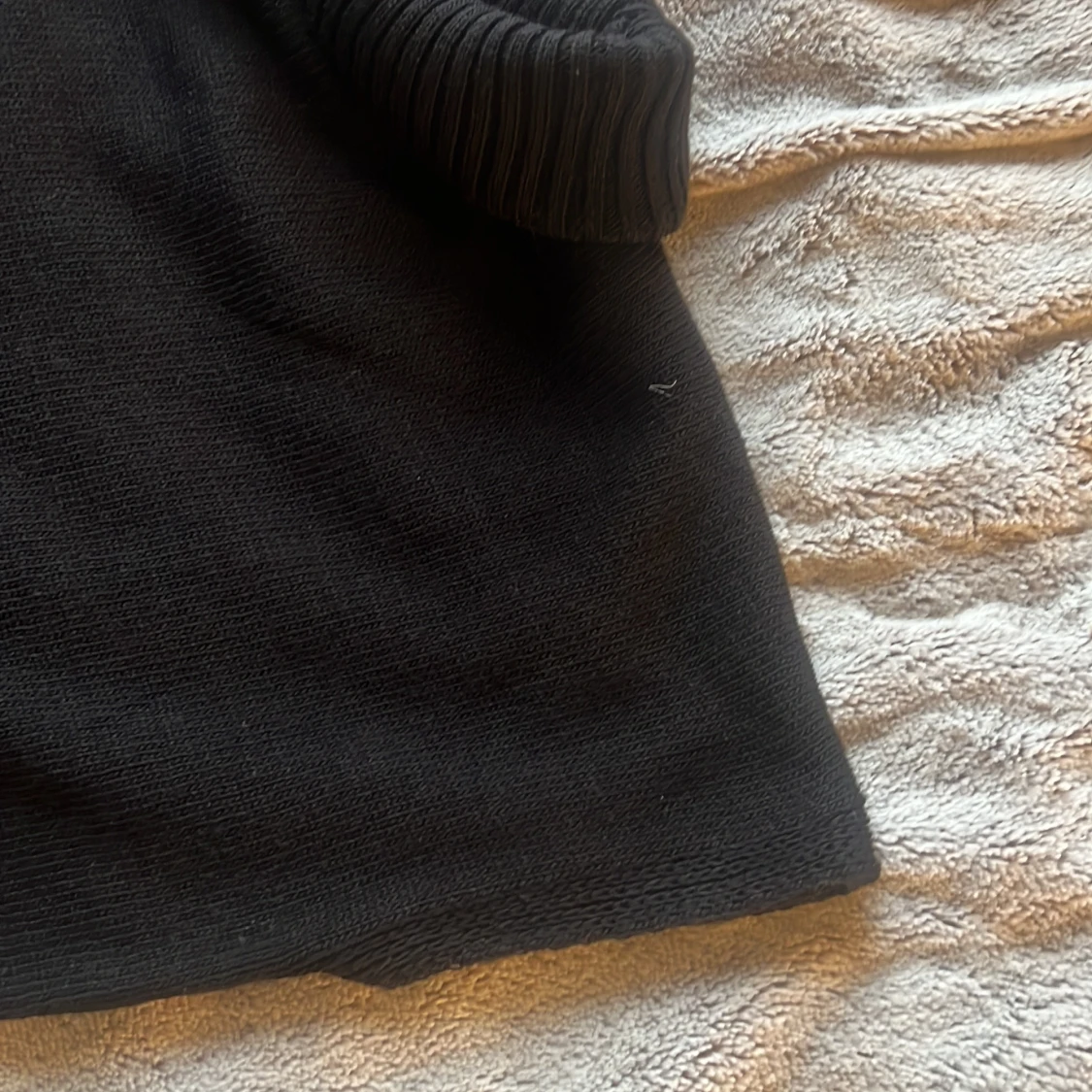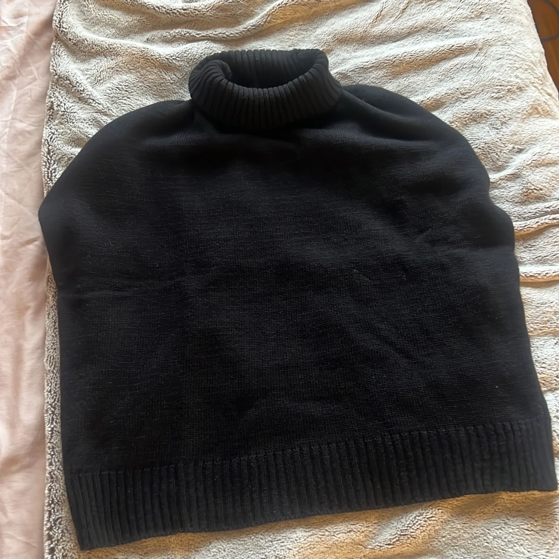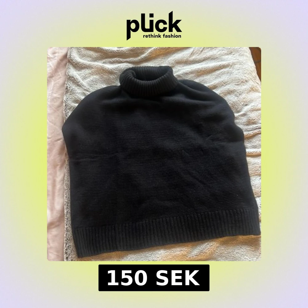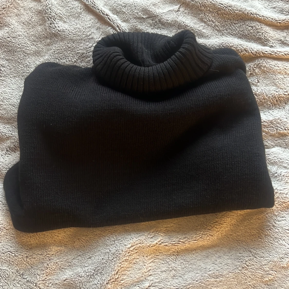 En svart polotröja i stickat material med hög, ribbad krage. Tröjan har en klassisk och enkel design utan synliga detaljer eller mönster, perfekt för lager-på-lager under kyliga dagar.