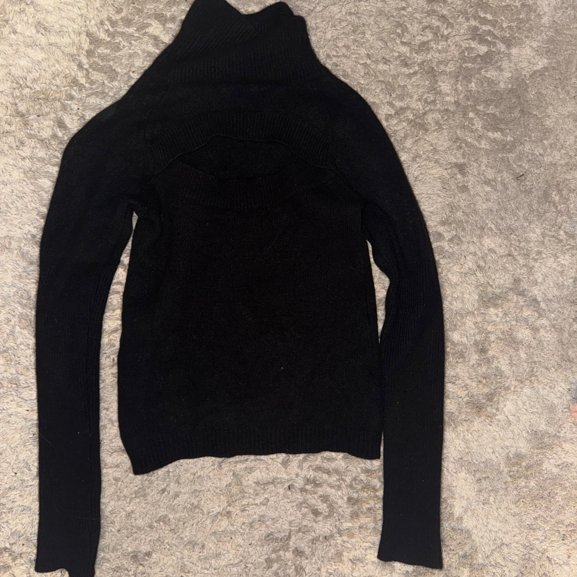 Svart polotröja i stickat material med lång ärm och en snygg cut out-detalj på ryggen. Tröjan har en hög krage och sitter tajt mot kroppen, perfekt för dig som vill ha en stilren men ändå unik look. I ullmaterial
