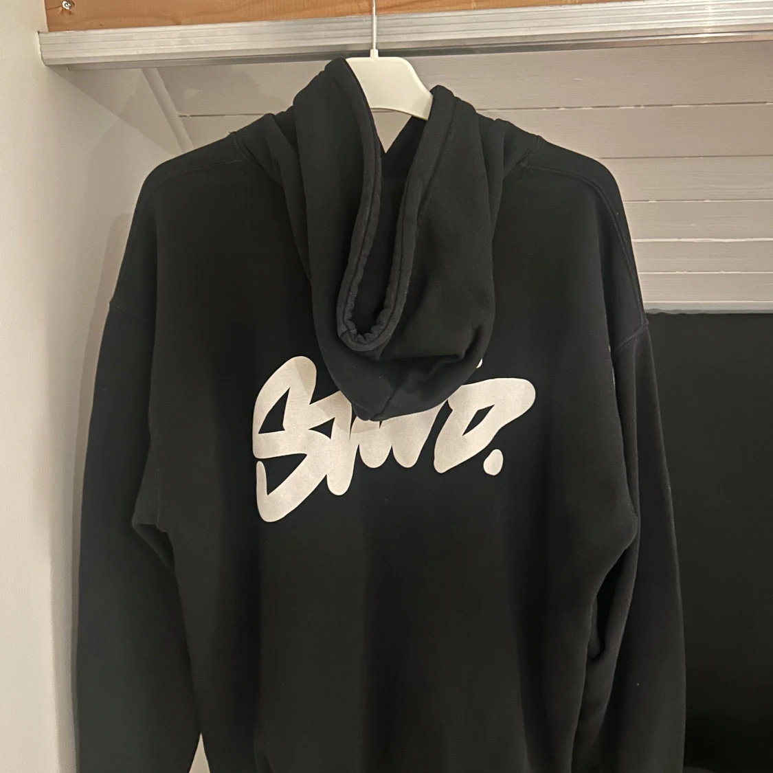Svart hoodie från SWTP med vit logga på bröstet och stort tryck på ryggen. Klassisk känguruficka, huva med snörning och mjukt material. Perfekt för dig som gillar streetwear och enkel stil.