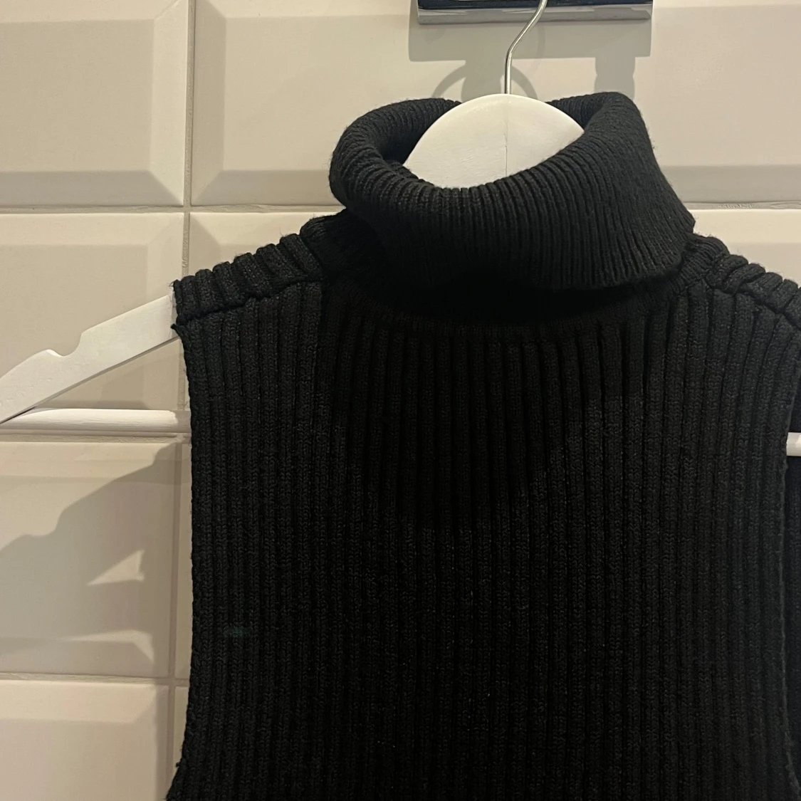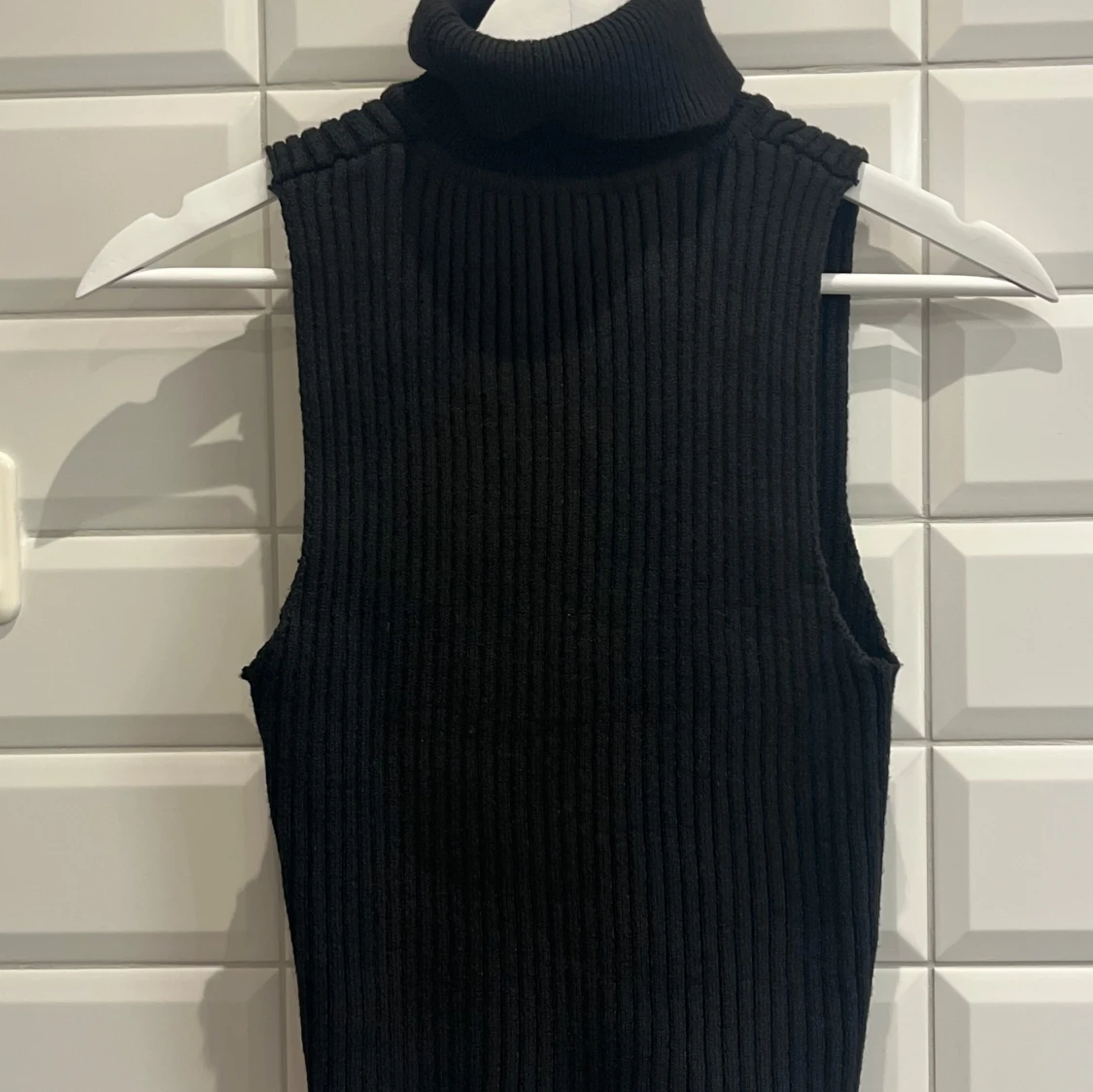 Snygg svart ärmlös polotröja med ribbad design. Perfekt för lager-på-lager eller som ett stilrent basplagg. Polokragen ger en extra touch av elegans. Aldrig använd. Säljer för 70 kronor.✨