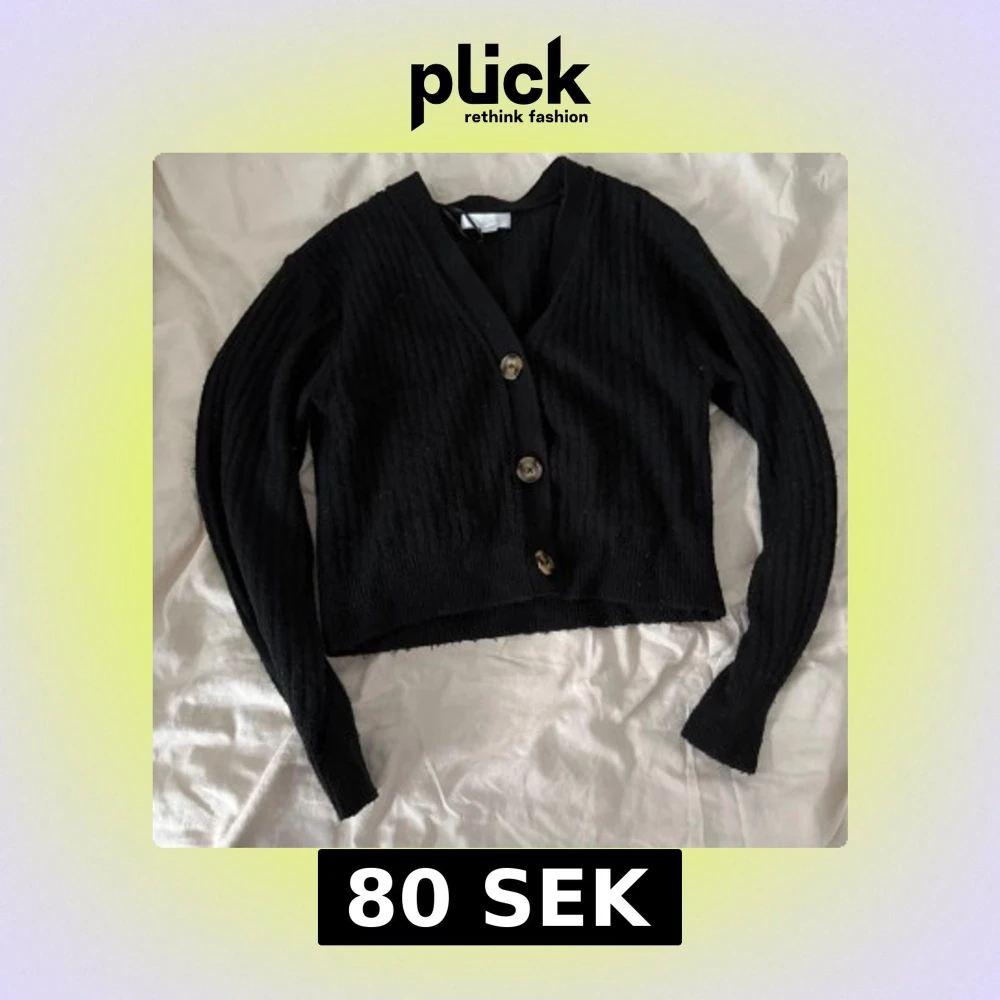 Svart ribbad kofta från H&M med v-ringning och tre stora knappar framtill. Modellen är croppad och har långa ärmar. Perfekt att slänga över en topp för en chill look. Den är väl använd men inga som helst fel på.