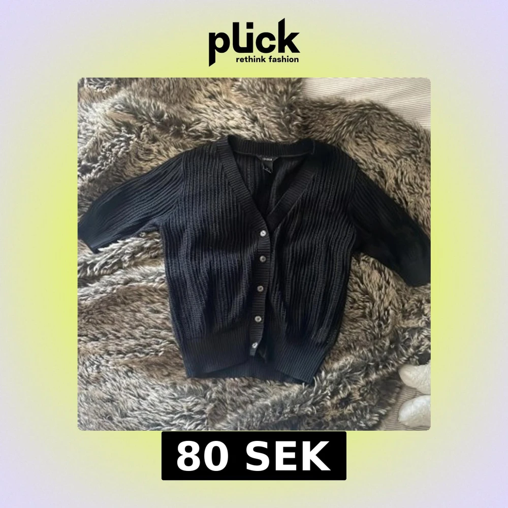 Svart kofta från Lindex i storlek S med ribbad stickning och snygga knappar framtill. Koftan har korta ärmar och v-ringad hals, perfekt att slänga på över en t-shirt eller linne. Materialet är stickat och ger en chill och stilren vibe.