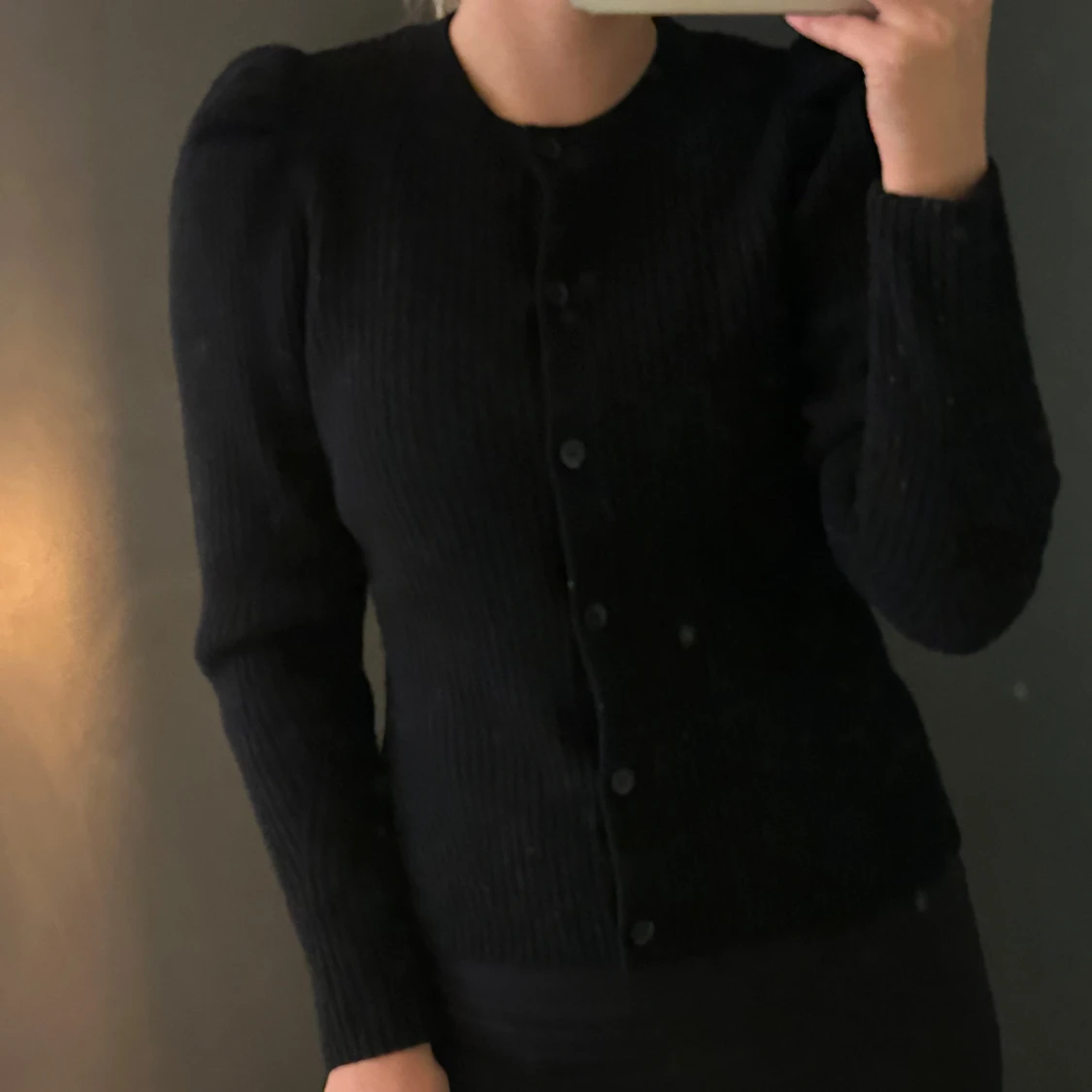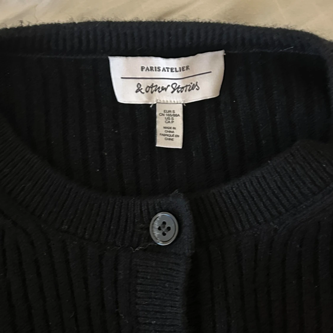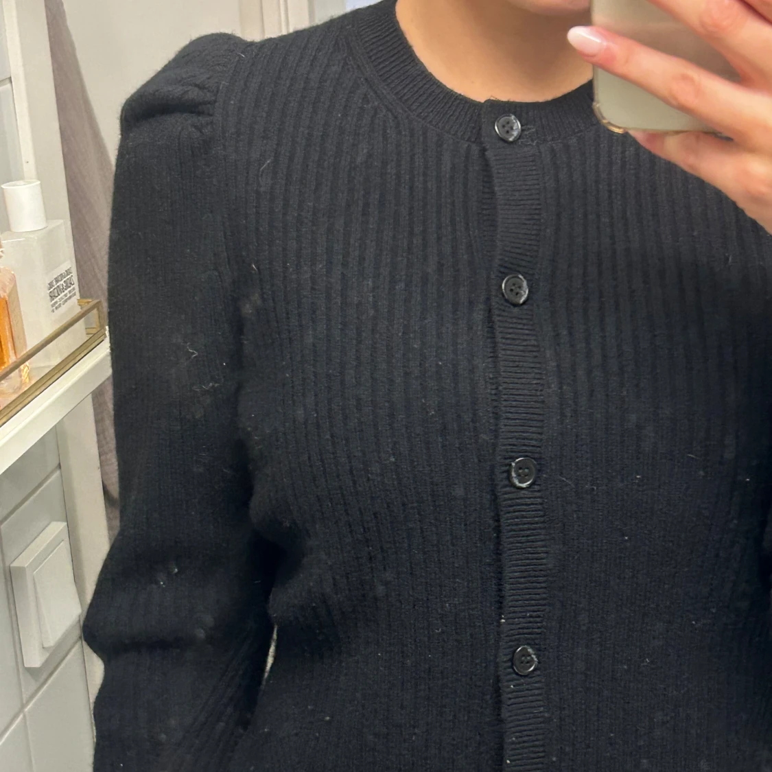 Säljer en svart ribbstickad ull kofta från & Other Stories . Koftan har puffade axlar, rund halsringning och knäppning framtill med svarta knappar. Knappt använd så är i superform skick, skulle säga att den passar S och M 💞