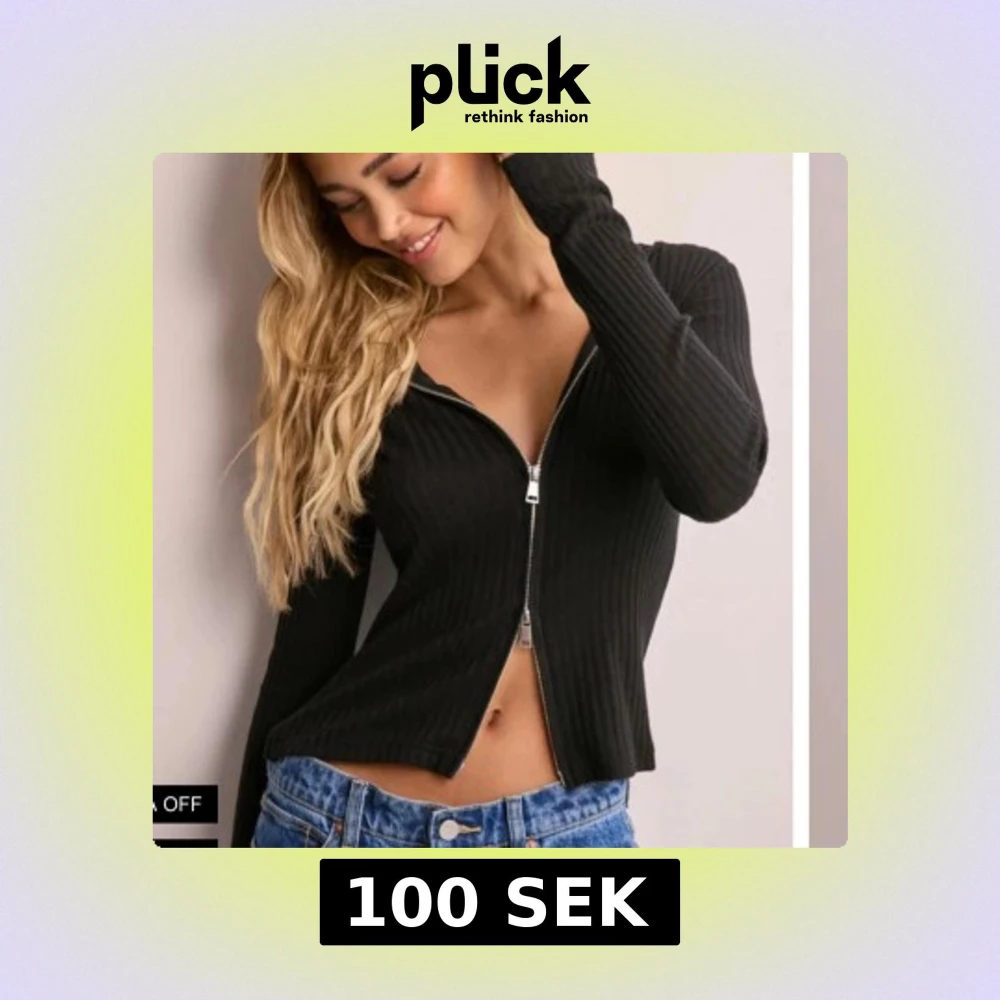 Säljer en svart ribbad kofta med lång ärm och dragkedja framtill. Tröjan har en figurnära passform och är tillverkad i ett stretchigt, stickat material. Perfekt att styla med jeans för en chill look.