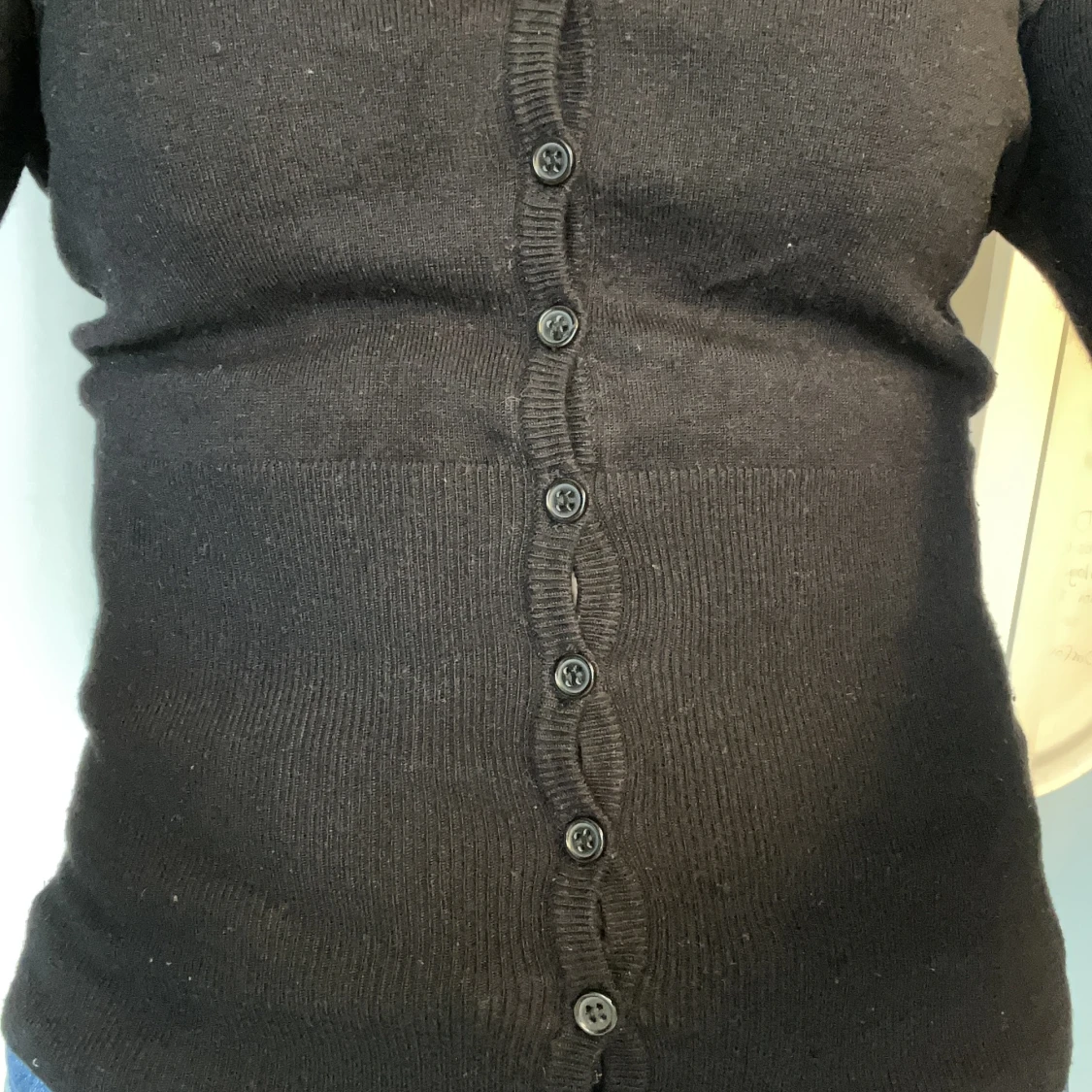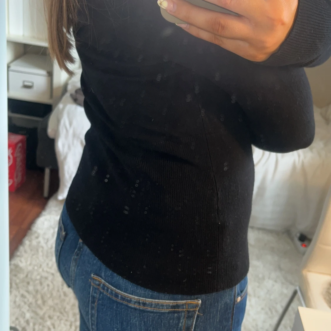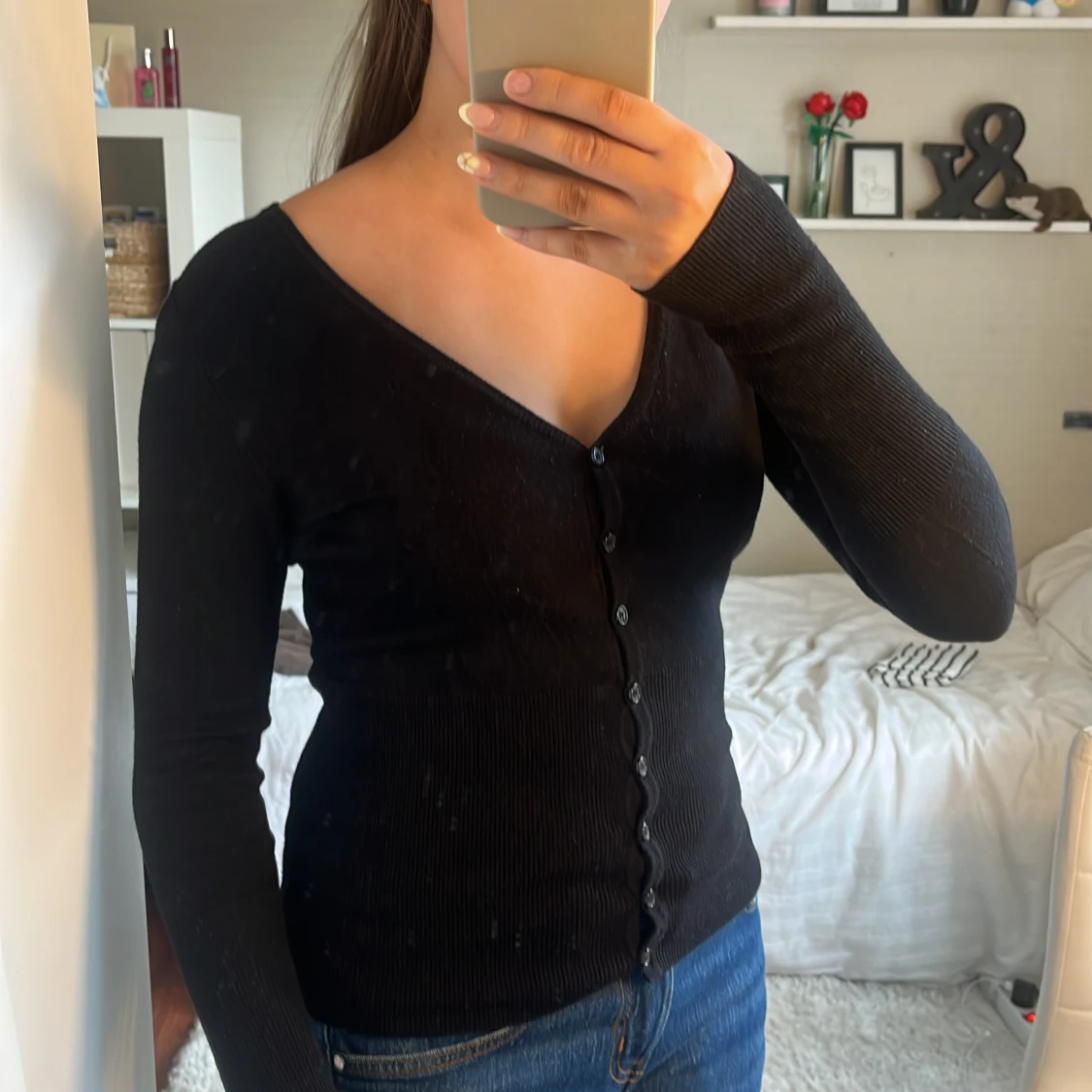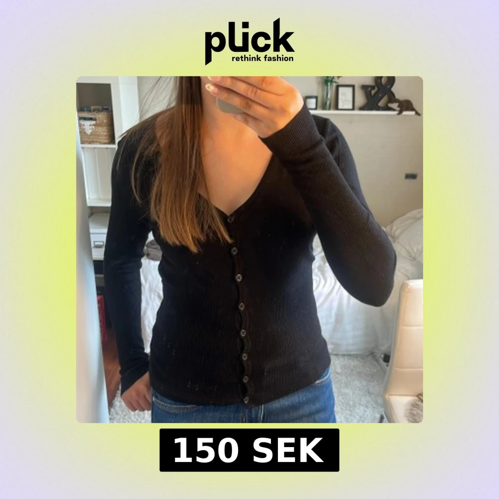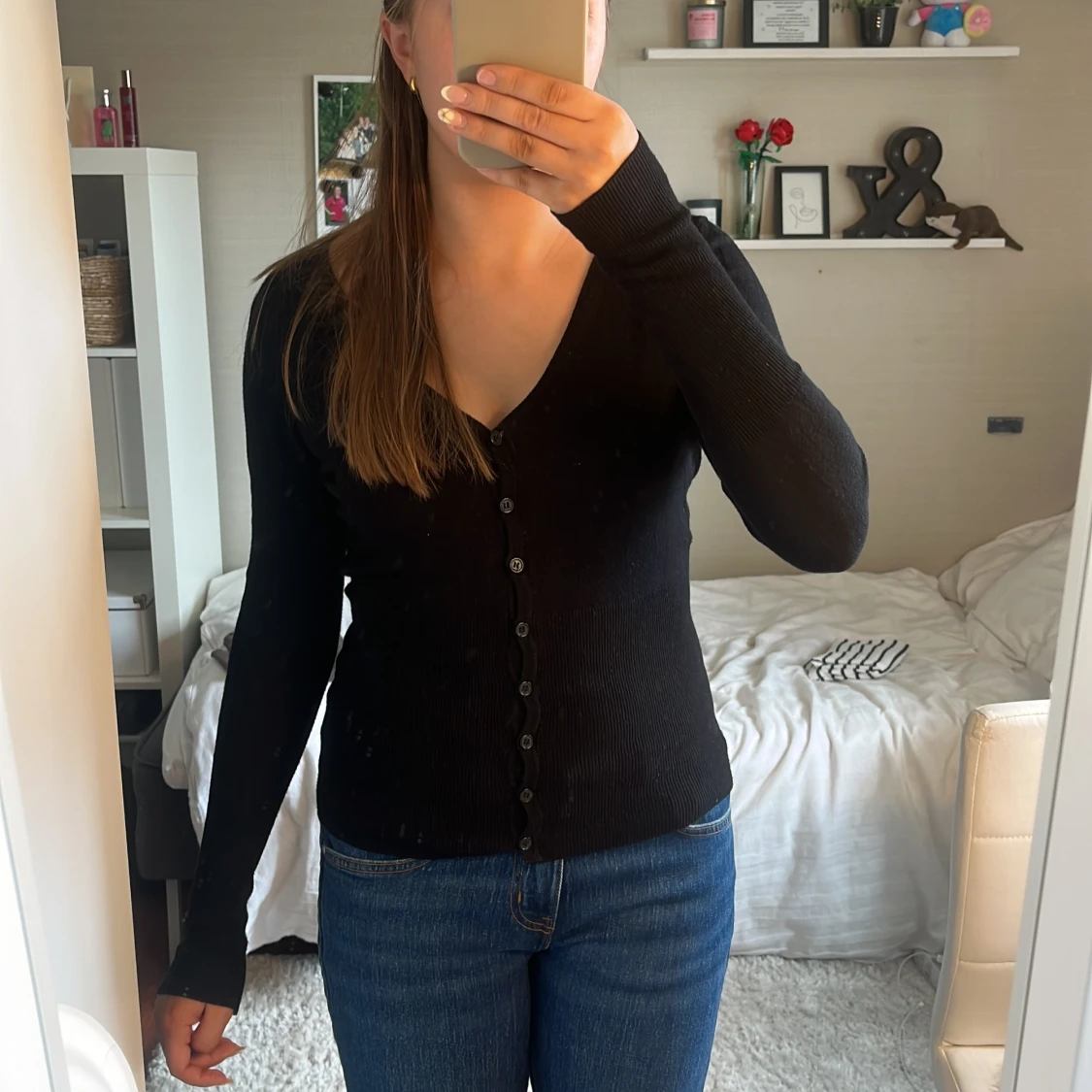 Säljer en svart, ribbad kofta med v-ringad hals och långa ärmar. Koftan har en rad svarta knappar framtill och sitter snyggt med en slim passform. Perfekt att slänga över en t-shirt eller bära som den är. Materialet är mjukt och stickat. Jag bär oftast S, och den är lite för tajt på mig. Skulle ändå säga att den passar xs och s, om man vill ha den lite tajt!😇