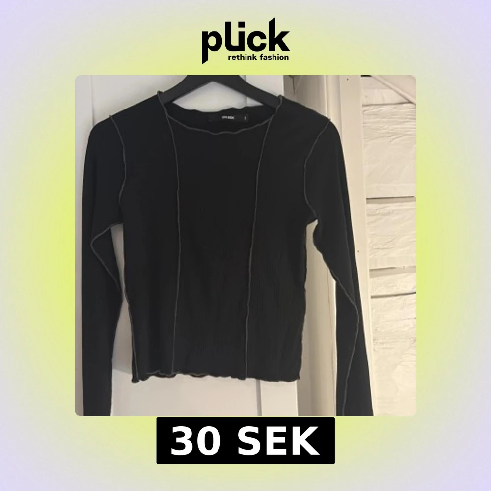 Svart långärmad topp från BikBok med ribbad struktur och synliga sömmar i kontrastfärg. Modellen är croppad och har en rå kant vid halsen för en trendig look. Perfekt till jeans eller kjol. Hör av er vid intresse!💕
