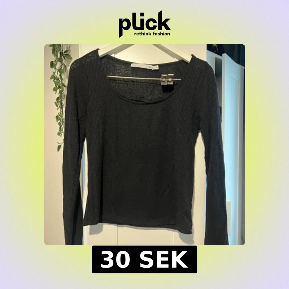 Svart långärmad topp från 157 med ribbad struktur och rund halsringning. Snygg detalj med svart spetskant vid halsen som ger en extra touch. Tunn och stretchig, perfekt att styla med jeans eller kjol. Inte använd alls.