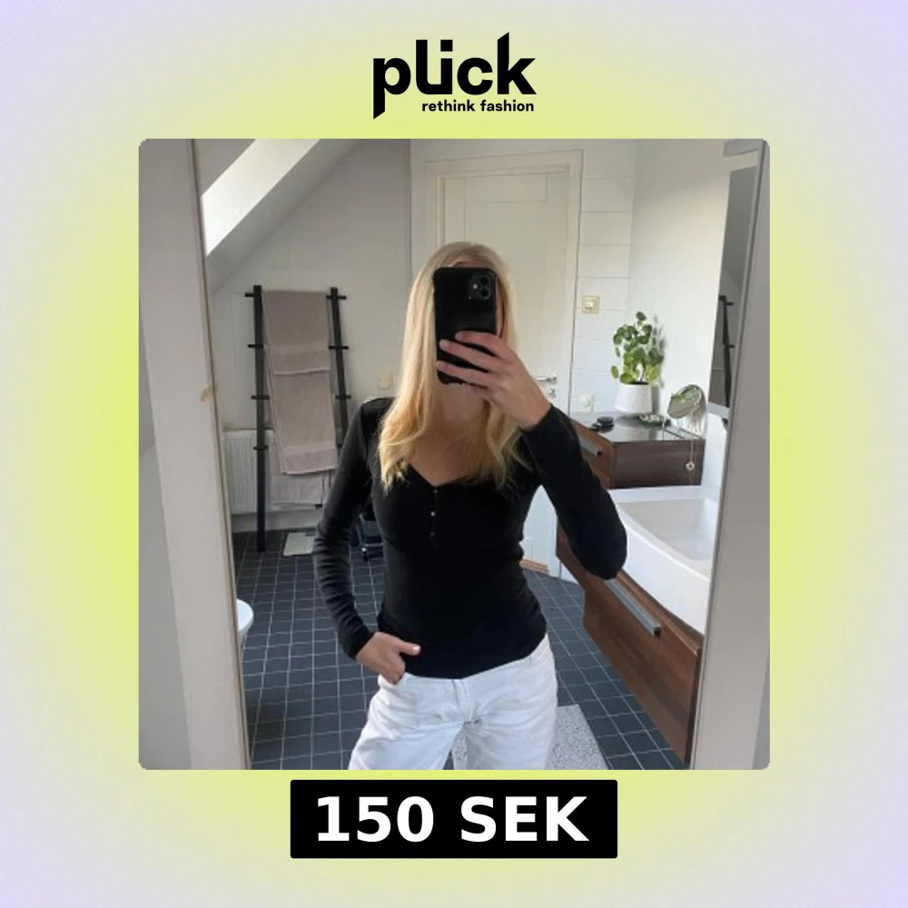Svart långärmad topp med v-ringning och knappar framtill. Tröjan är ribbad och har en slim passform som sitter snyggt på kroppen.