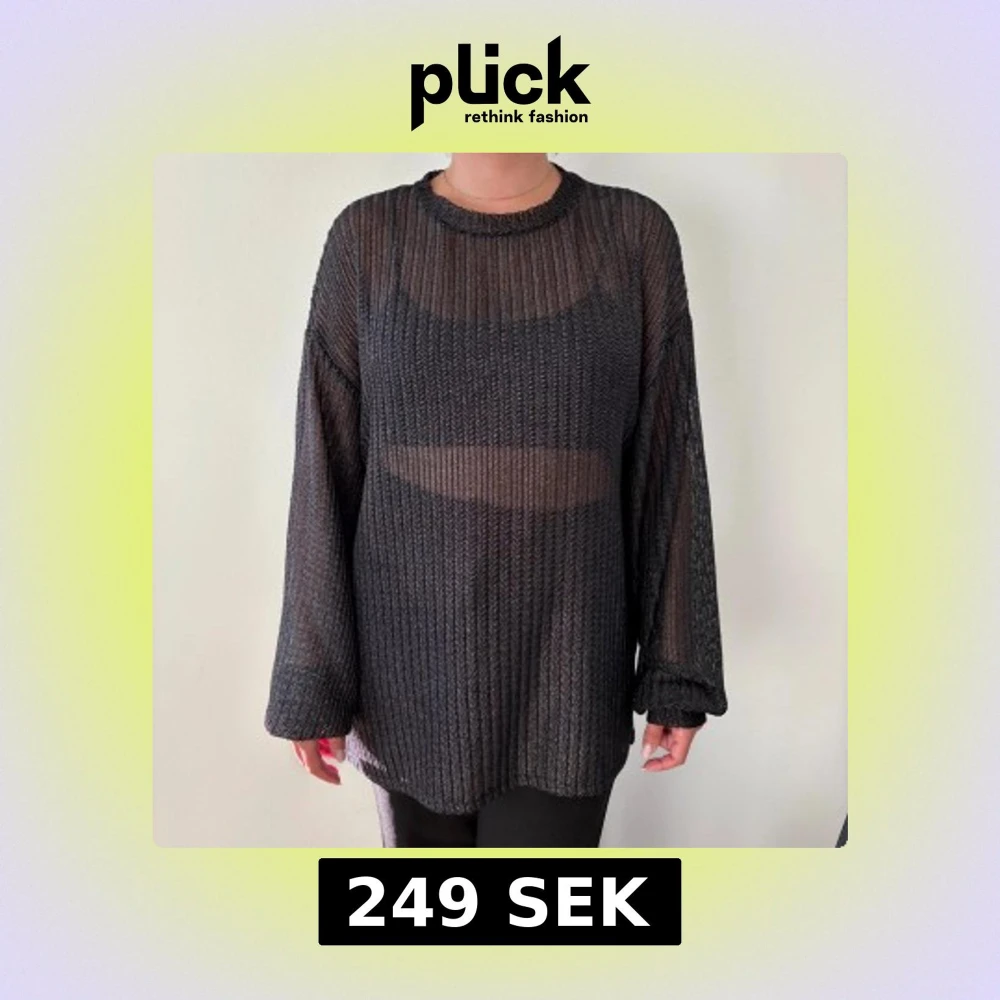 Säljer en svart, transparent metallic/glittrig meshtröja med ribbad struktur och lång ärm. Tröjan har en loose passform och rund halsringning, perfekt för att styla lager på lager. Materialet är lätt och luftigt, vilket gör den riktigt skön och edgy.