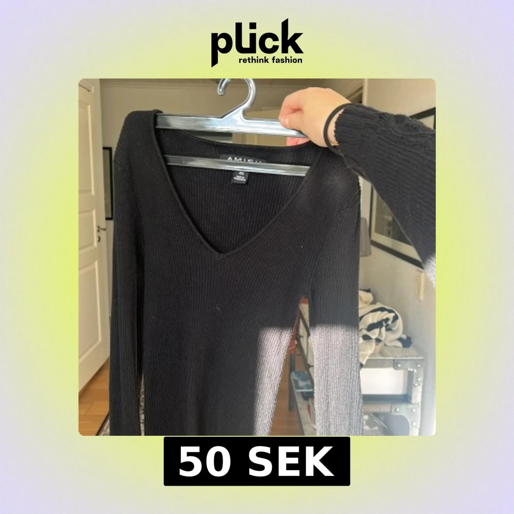 Svart stickad tröja från Amisu i storlek XS. Tröjan har ribbad struktur, djup v-ringning och långa ärmar. Perfekt för lager-på-lager och funkar året runt. Snygg och enkel att matcha med allt.