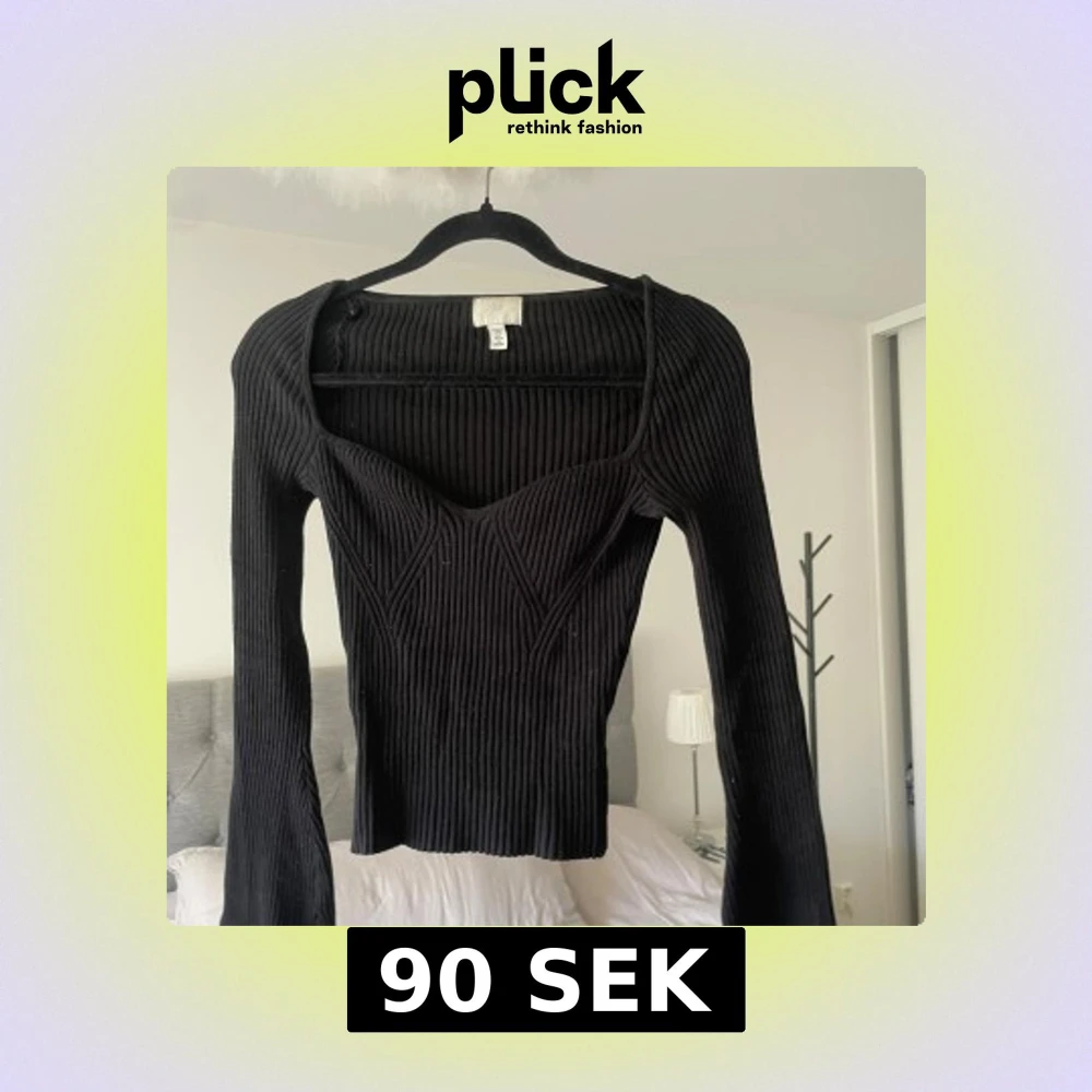 Svart långärmad ribbad topp från H&M i storlek S, med markerad byst och hjärtformad urringning. Den har stretchigt material och är använd men ändå i mycket bra skick.