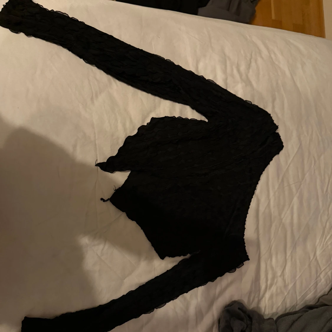 Säljer en svart ribbad topp från Shein med långärmad design. Perfekt för en stilren look. Toppen har en åtsittande passform och är tillverkad i ett mjukt material.