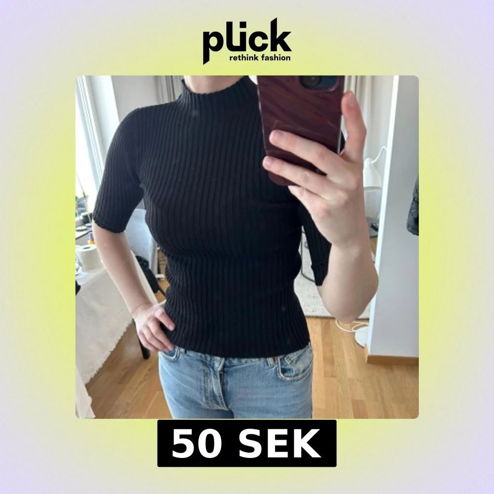 Säljer en svart ribbad topp med halv polokrage och korta ärmar. Tröjan är tight i modellen och har en stretchig passform som sitter snyggt på kroppen. Perfekt att styla med jeans eller kjol för en clean look. Använd 1 gång.