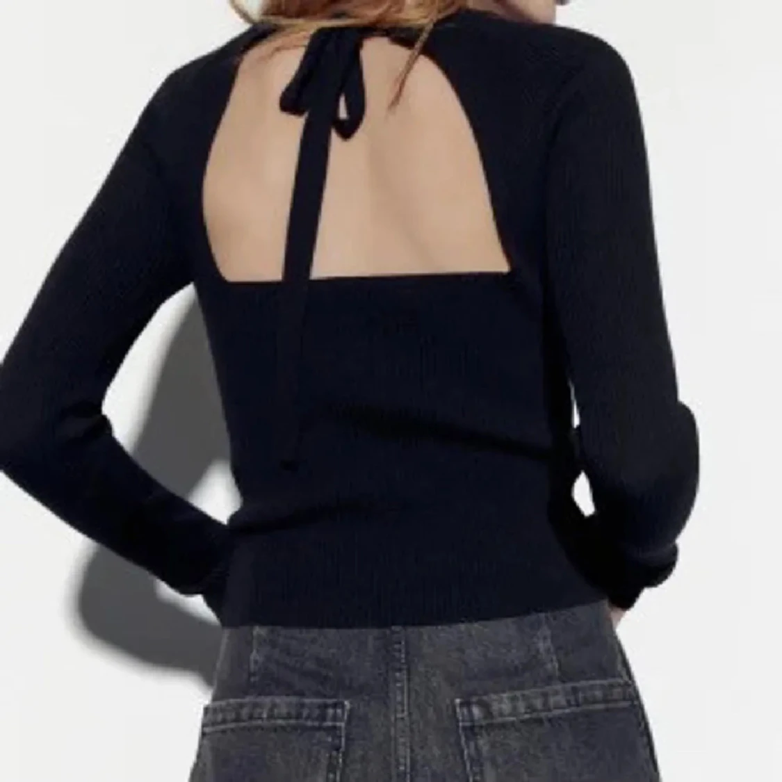 Säljer en svart ribbad topp med lång ärm och snygg öppen rygg som knyts i nacken. Skriv för frågor elelr bilder ☺️🥰