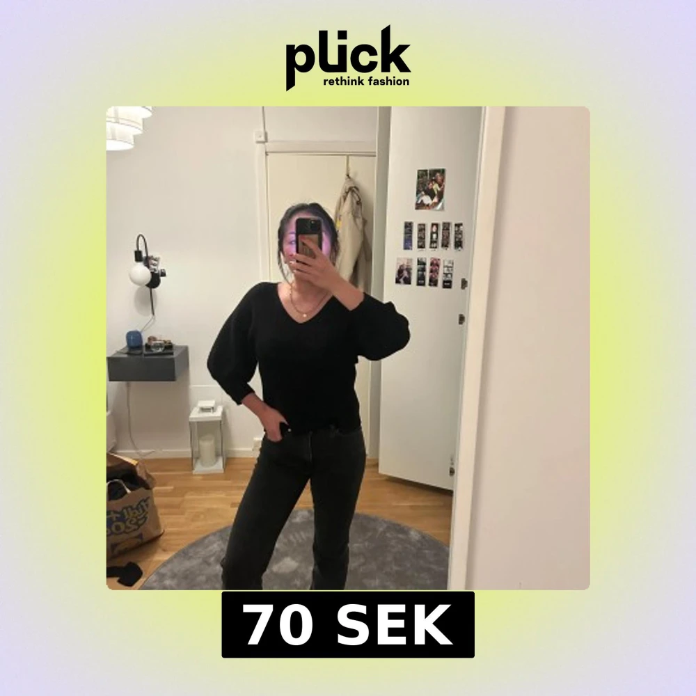 Säljer en stilren svart ribbad tröja från Lindex med v-ringning. Storlek M