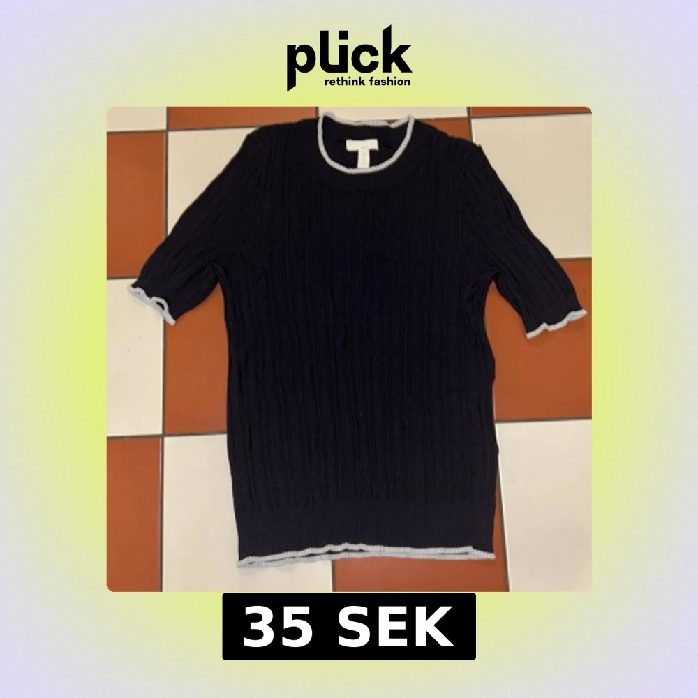 Säljer en svart ribbad tröja från H&M Basics. Tröjan har korta ärmar och vita detaljer vid hals och ärmslut. Perfekt för en stilren look.