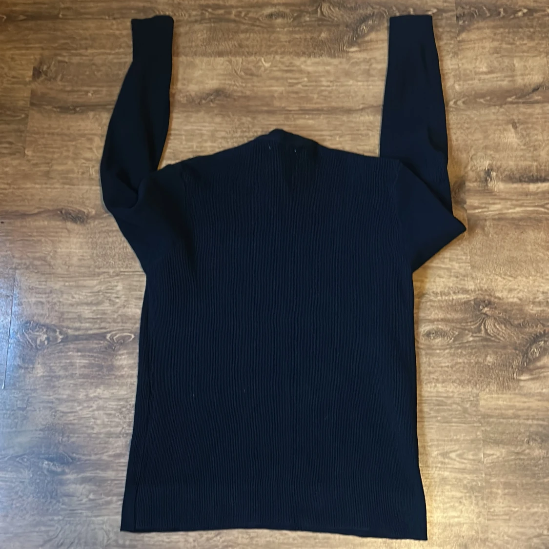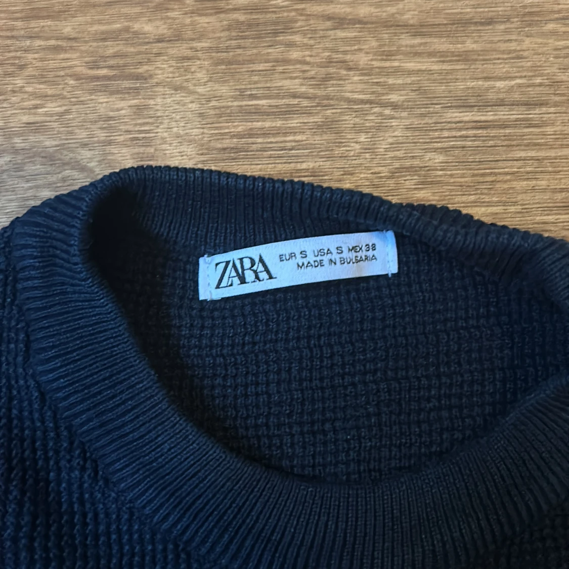 Säljer en stilren svart ribbad tröja från Zara. Tröjan har långa ärmar och en klassisk rund halsringning. Perfekt för en minimalistisk look.