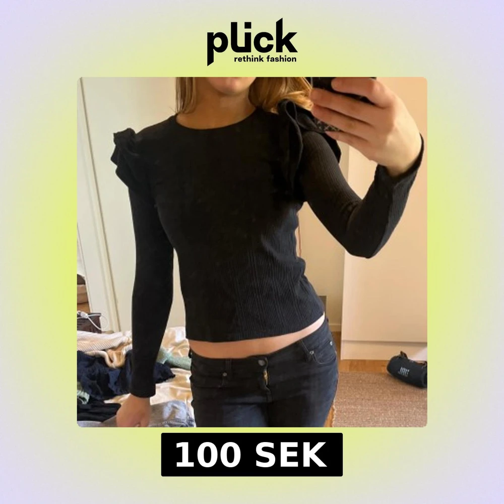Snygg svart ribbad tröja med volangdetaljer på axlarna. Tröjan har långa ärmar och en tight passform, perfekt för en stilren look. Knappt använd