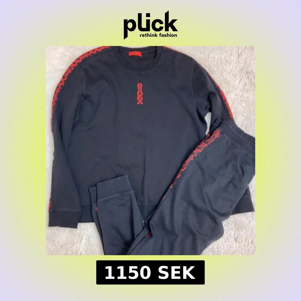 Säljer en svart tröja med röda broderade detaljer längs ärmarna och benen.