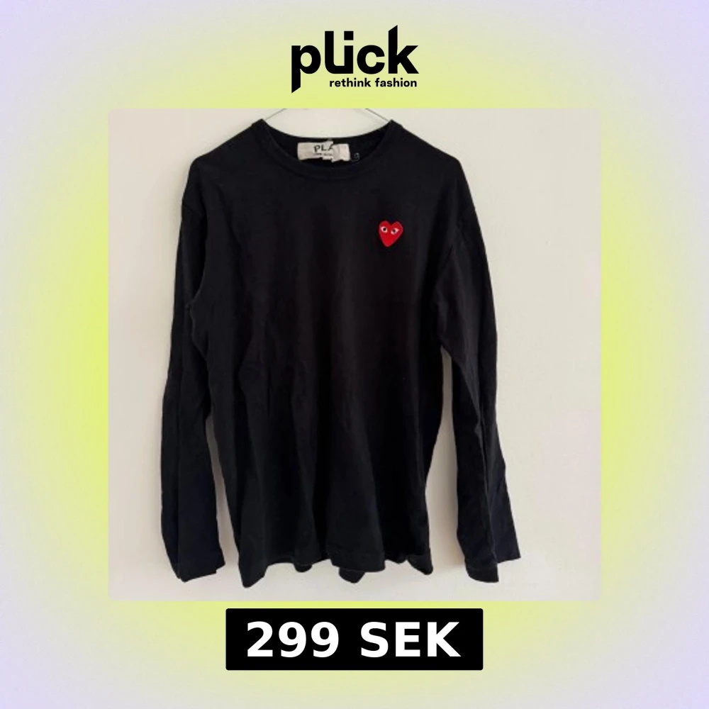 Svart långärmad tröja från Comme des Garçons Play med det ikoniska röda hjärtat broderat på bröstet. Enkel och stilren design i mjuk bomull, perfekt för alla tillfällen. Sparsamt använd! Lika snygg på kille som tjej!