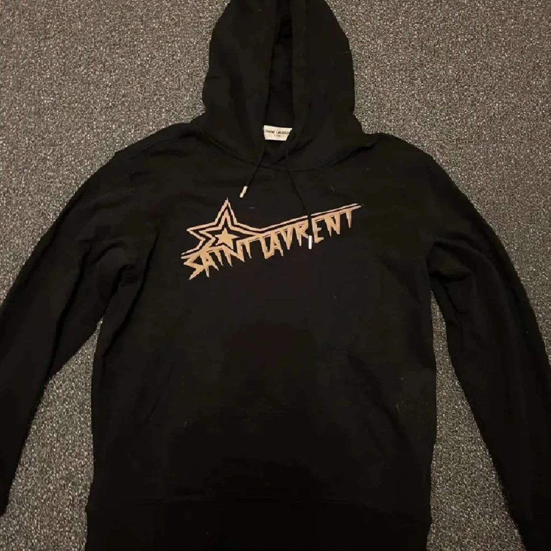 Svart hoodie från Saint Laurent med stort beige tryck och stjärndetalj på bröstet. Klassisk huva med snörning och känguruficka framtill. Perfekt för dig som vill ha en streetig och trendig look.
