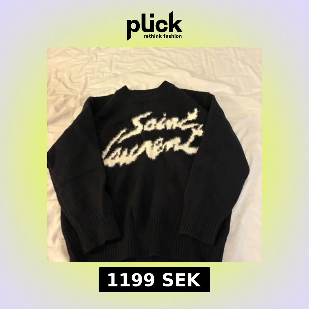 Svart stickad tröja från Saint Laurent med vit, fuzzy logotyp framtill. Tröjan har rund halsringning, ribbade muddar och en relaxed fit. Perfekt för dig som vill ha en statement piece med lyxig känsla och cool design.