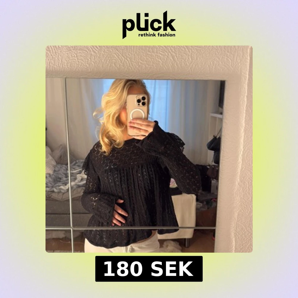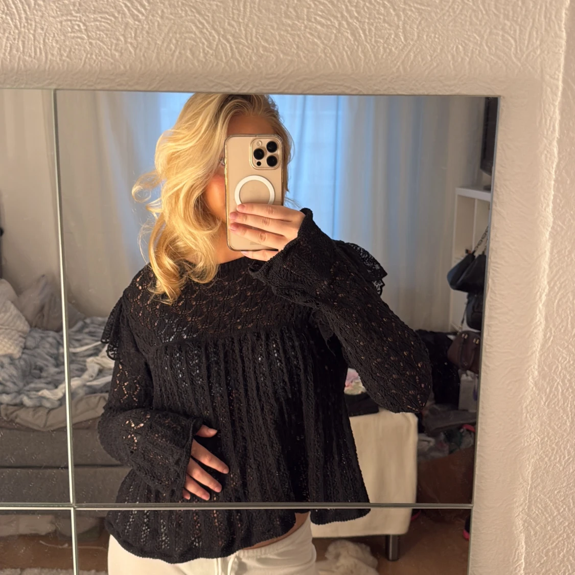 Säljer en svart blus med vackra spetsdetaljer och volang vid axlarna. Blusen har långärmade, lätt utsvängda ärmar och ett luftigt, romantiskt fall. Perfekt för dig som gillar en feminin och trendig look. Storlek XL men passar mig som brukar ha S/M
