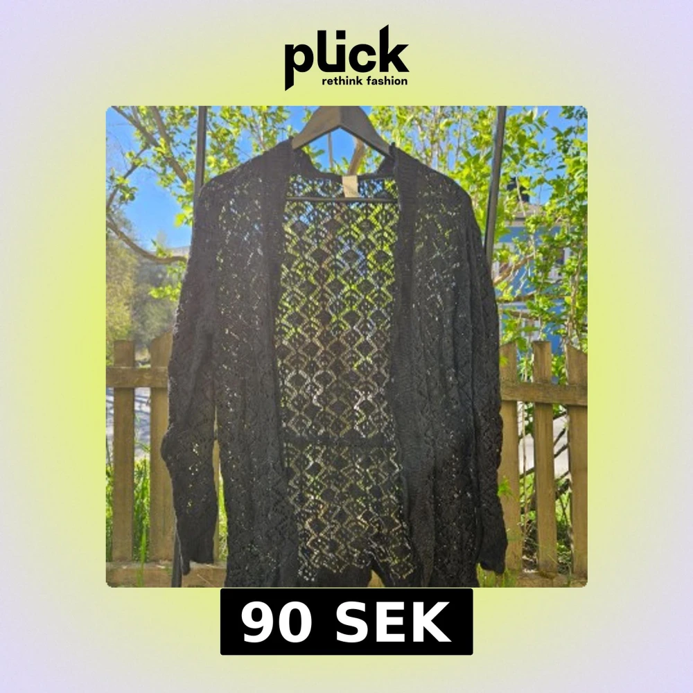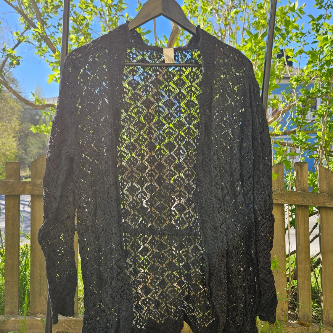 Säljer en svart kofta med spetsdetaljer och genombrutet mönster. Perfekt att slänga över en topp för en snygg lager-på-lager-look. Koftan har lång ärm och är öppen framtill.