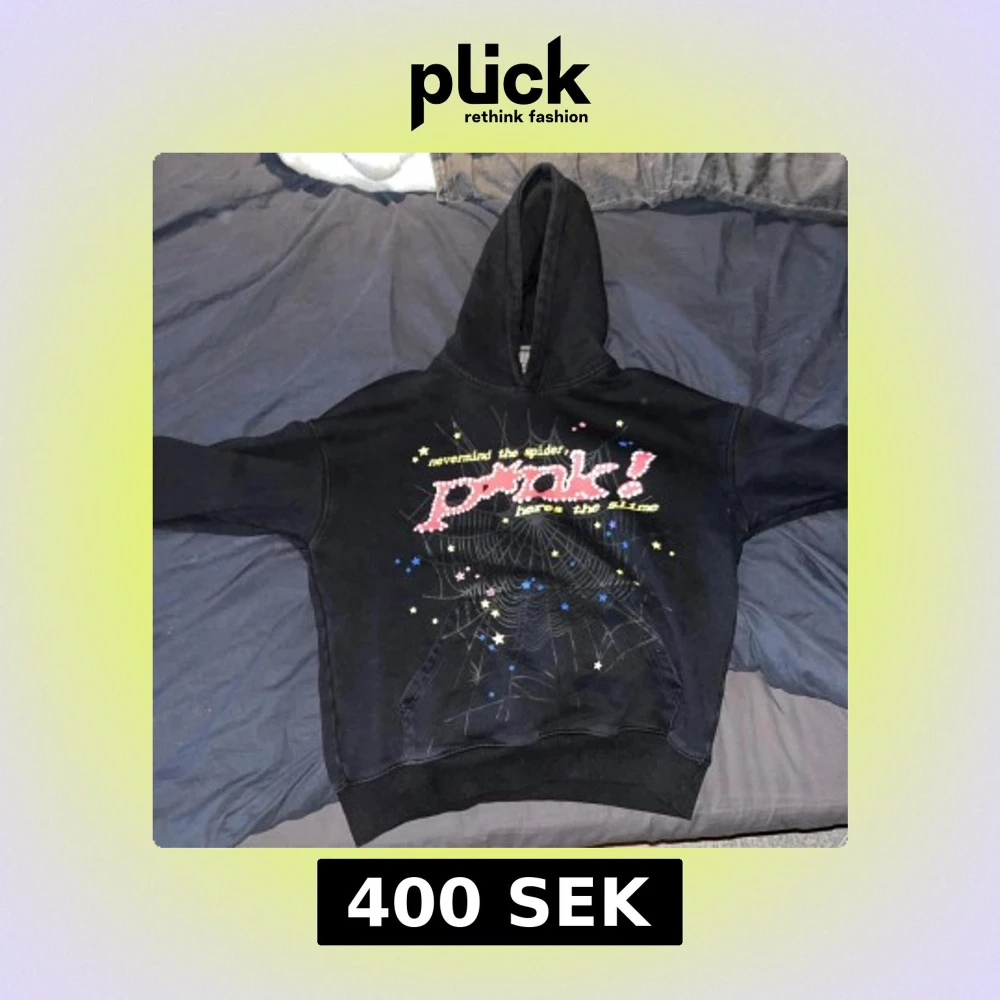 Svart hoodie från spider! med färgglatt tryck framtill, spindelnätsmönster och texten 'nevermind the spider, here’s the slime'. Flera små stjärnor i gult, blått och rosa samt en stor gul stjärna på ryggen. Klassisk huva och känguruficka.
